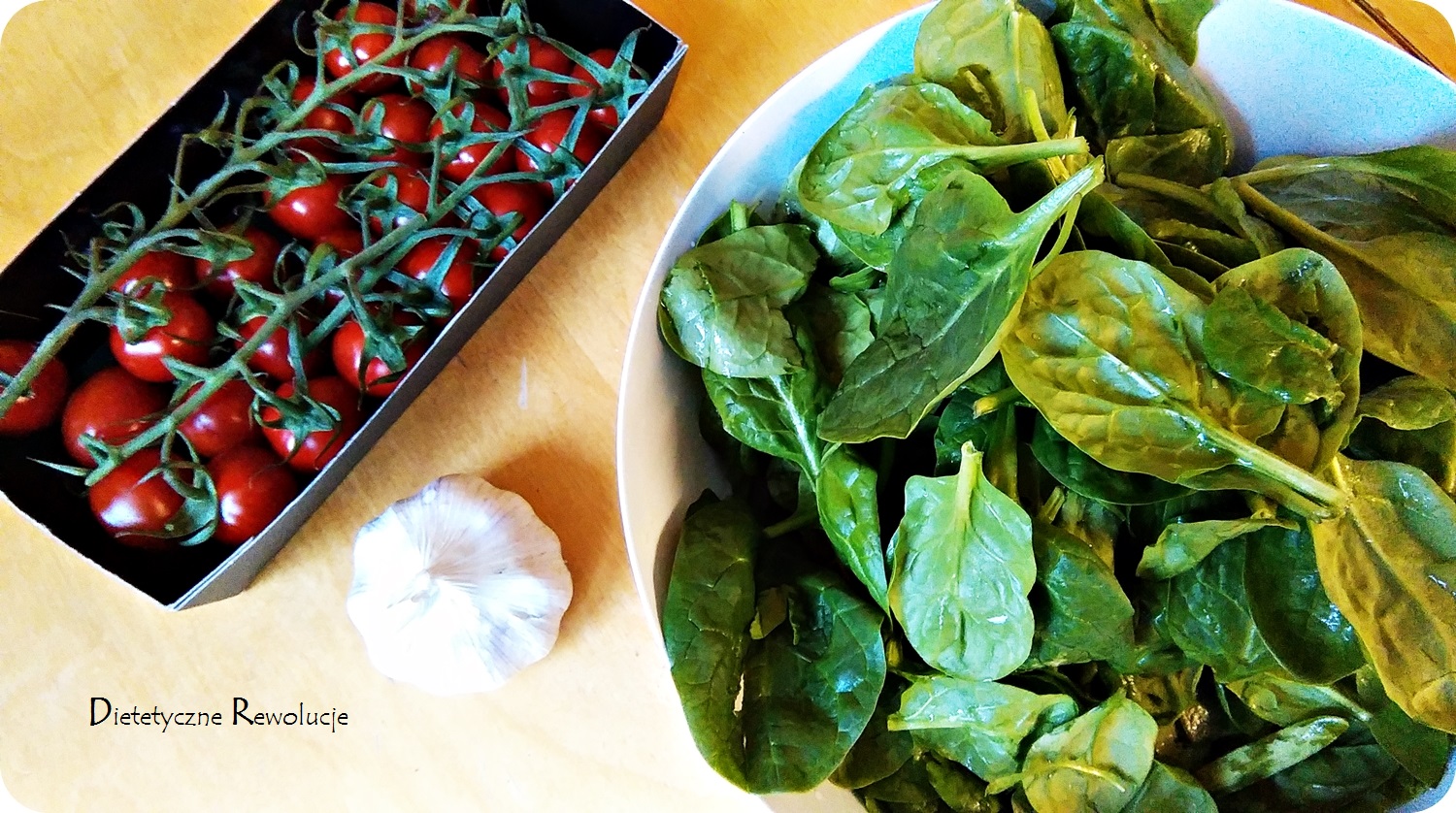 2. Szpinak i pomidorki płuczemy. Na patelni rozgrzewamy 1 łyżkę masła klarowanego i wyciskamy 3 ząbki czosnku. Dodajemy szpinak, przykrywamy i dusimy do momentu aż wypuści wodę, nie dłużej. Odcedzamy z nadmiaru wody