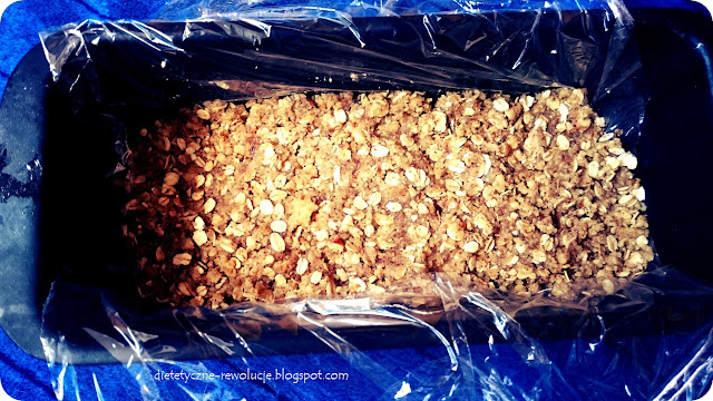 - Najpierw przygotowujemy spód. Orzechy mielimy na pył lub bardzo drobno siekamy. Mieszamy z płatkami, woda i miodem. Wylepiamy keksówkę, najlepiej na folii spożywczej wtedy będzie łatwiej przenieść. Wkładamy do zamrażalnika na 30 min