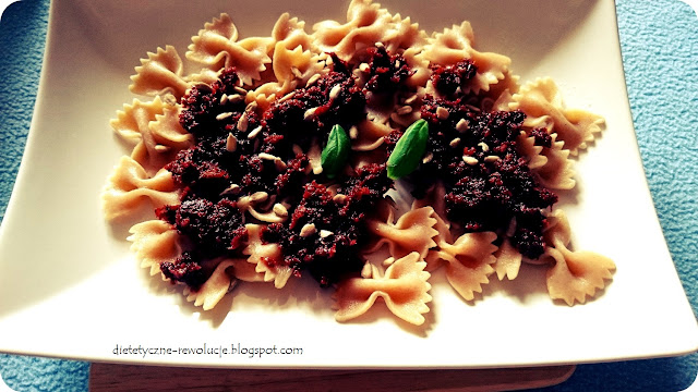 Jest to kaloryczne danie ze względu na dużą ilość tłuszczu w suszonych pomidorach, ale wystarczy na porcje makaronu dać łyżkę pesto, wymieszać i jest smaczne i wartościowe danie :)