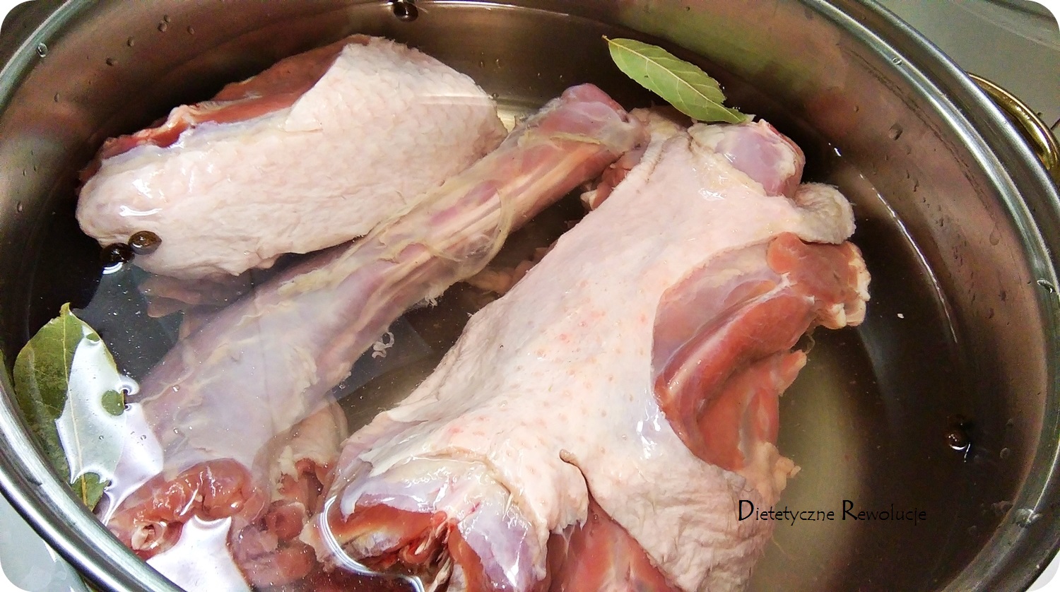 1. Mięso dobrze oczyszczamy- zostawiamy ze skórą bo to ona daje smak. Zalewamy ok 2,5 litra zimnej wody. Mięso musi być całe zakryte. Wrzucamy liście laurowe i ziele angielskie. Wstawiamy na największy ogień
