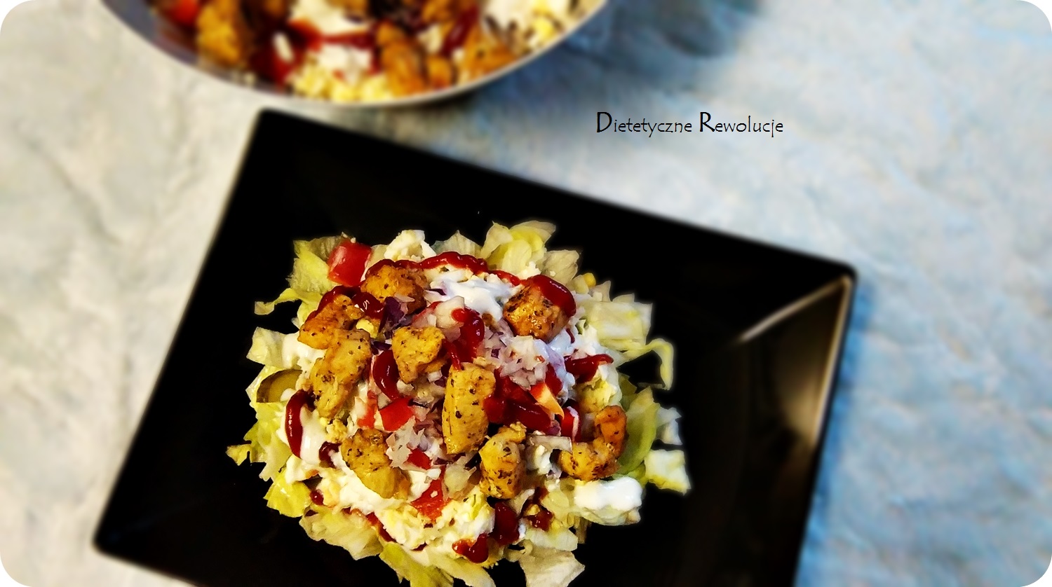 4. Układamy sałatkę warstwowo. Na dole sałata, ogórek, sos tzatziki, jajka, kukurydza, ketchup, papryka, sos, kurczak, ketchup