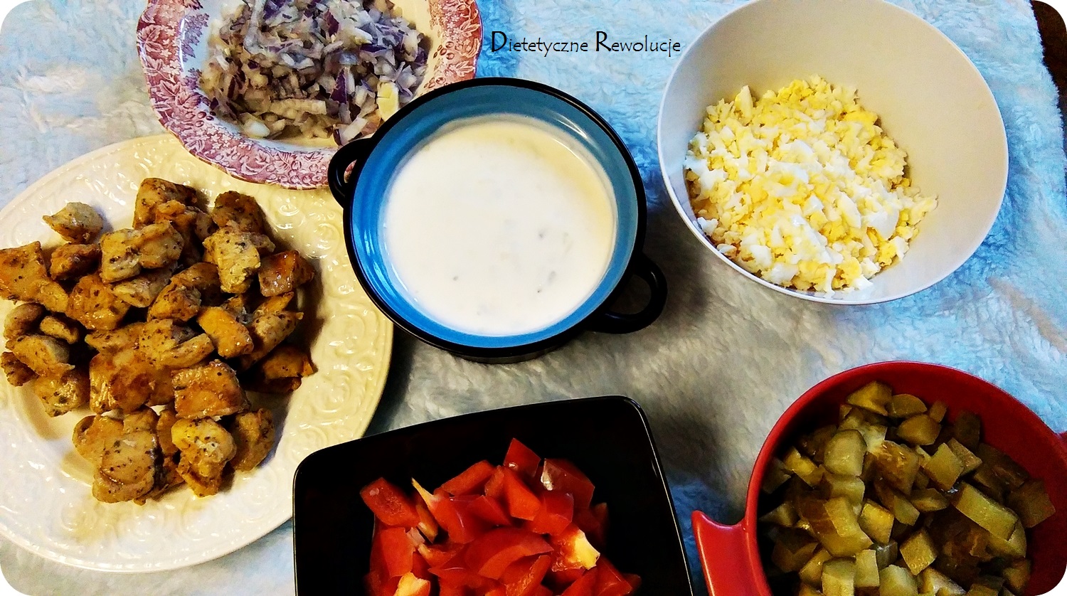 2. Jajka gotujemy na twardo. Kurczaka dusimy na maśle klarowanym. Sałatę, paprykę, cebulę, ogórki i jajka kroimy w kostkę. Kukurydzę odsączam i przepłukuję zimną wodą