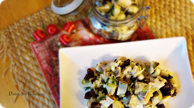 Moja propozycja to połączenie matjasa z suszonymi pomidorami i ogórkiem. Najlepiej jakby był kiszony lub małosolny bo ma najwięcej wartości odżywczych :) Jako fanka pomidorów suszonych jestem w niebie. Nie potrzeba mnóstwa oleju, wystarczy dać 2-3 łyżki,żeby danie nie było suche
