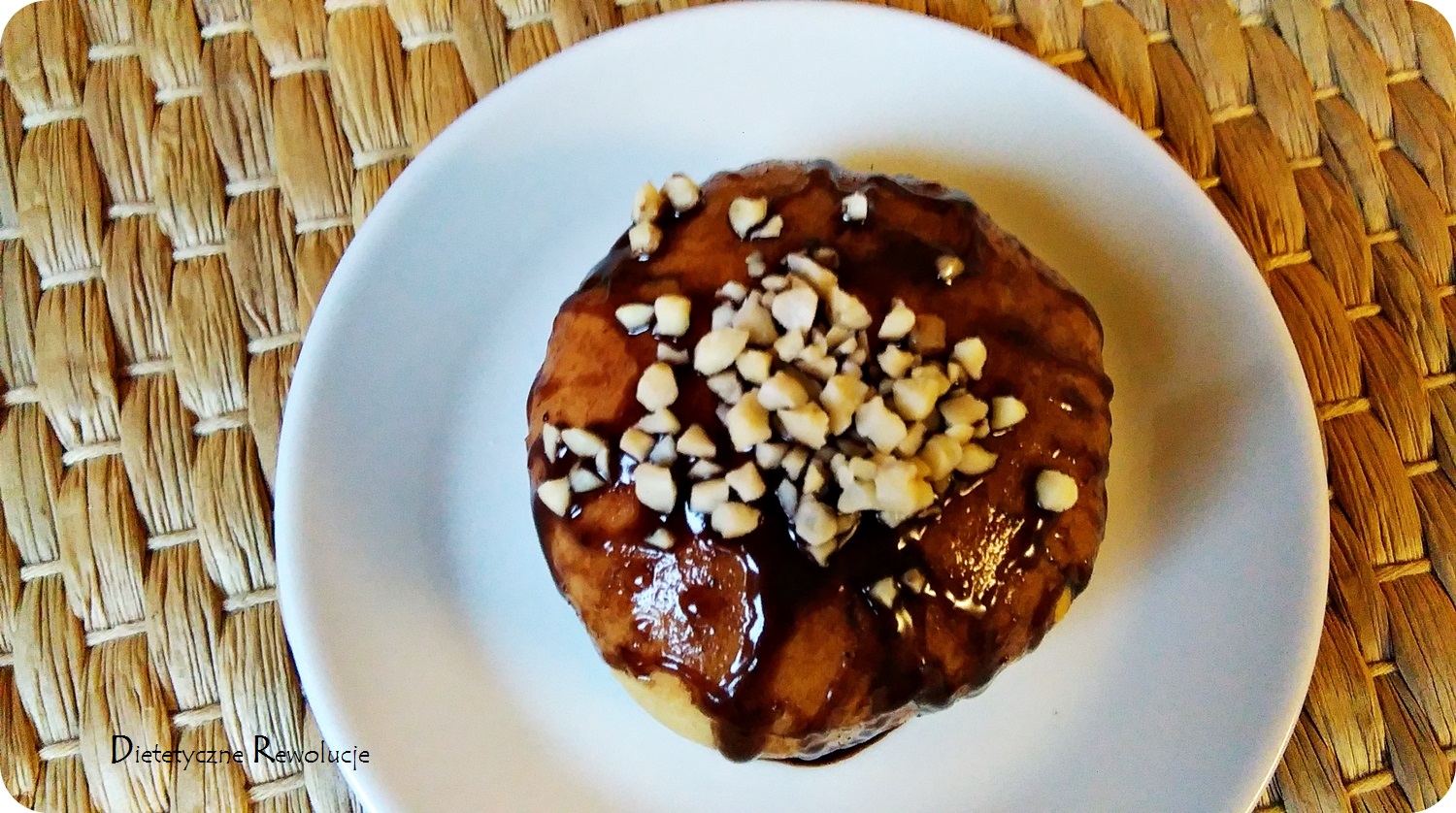 5. W kąpieli wodnej roztapiamy olej kokosowy, dodajemy miód. Dokładnie mieszamy, na koniec zdejmujemy z ognia, wsypujemy kakao, ewentualnie można dodać ulubiony aromat i polewamy bułeczki. Na koniec można posypać kawałkami orzechów. Najlepiej jeść od razu albo przechowywać w zamkniętym pudełku max 2 dni