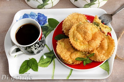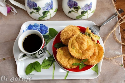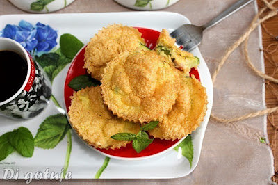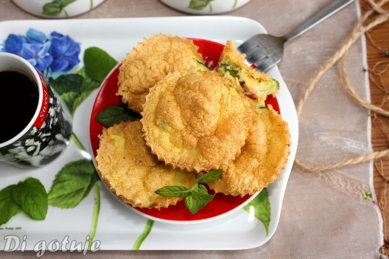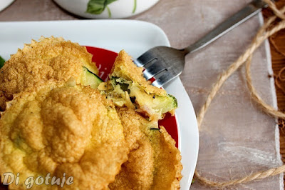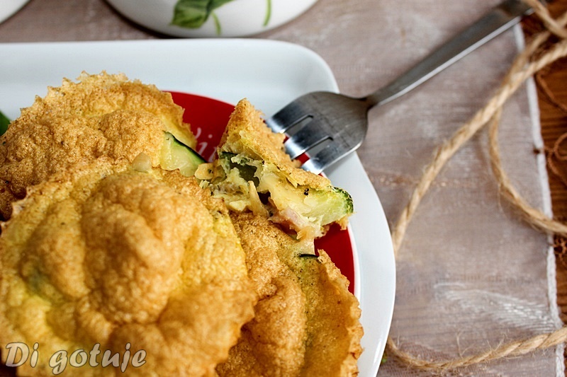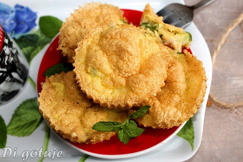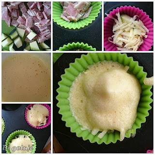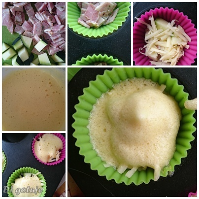 Formę do muffinek wysmarować masłem/olejem (silikonowych foremek nie należy natłuszczać) i w około 10 wgłębień kolejno umieścić po odrobinie szynki, cukinii oraz startego sera.