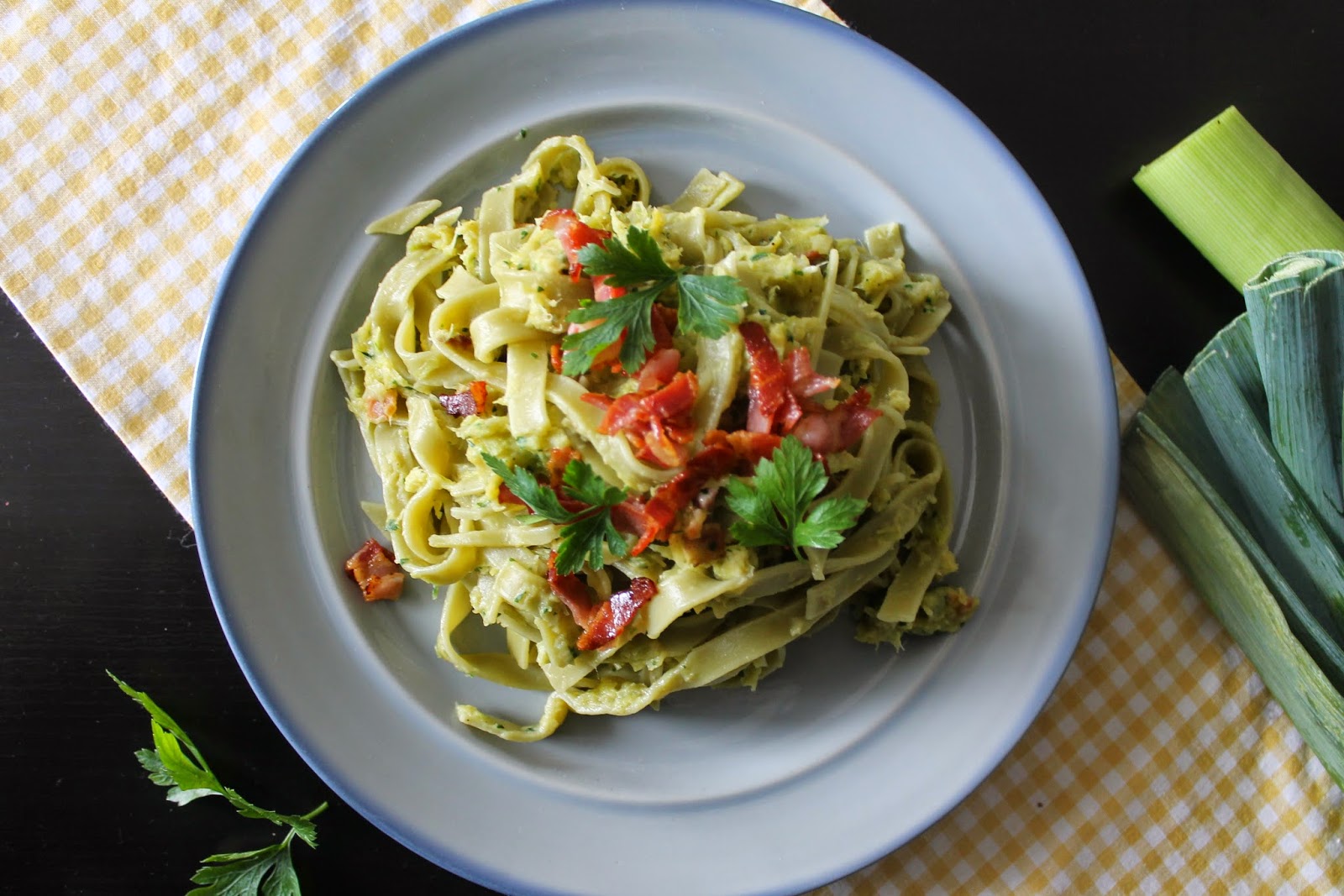Dzisiaj coś dla fanów pora. Czyli coś dla mnie, za to zdecydowanie nie dla K...Makaron z pesto z pora i wędzonym boczkiemSkładniki:makaron tagliatelle - 200 g