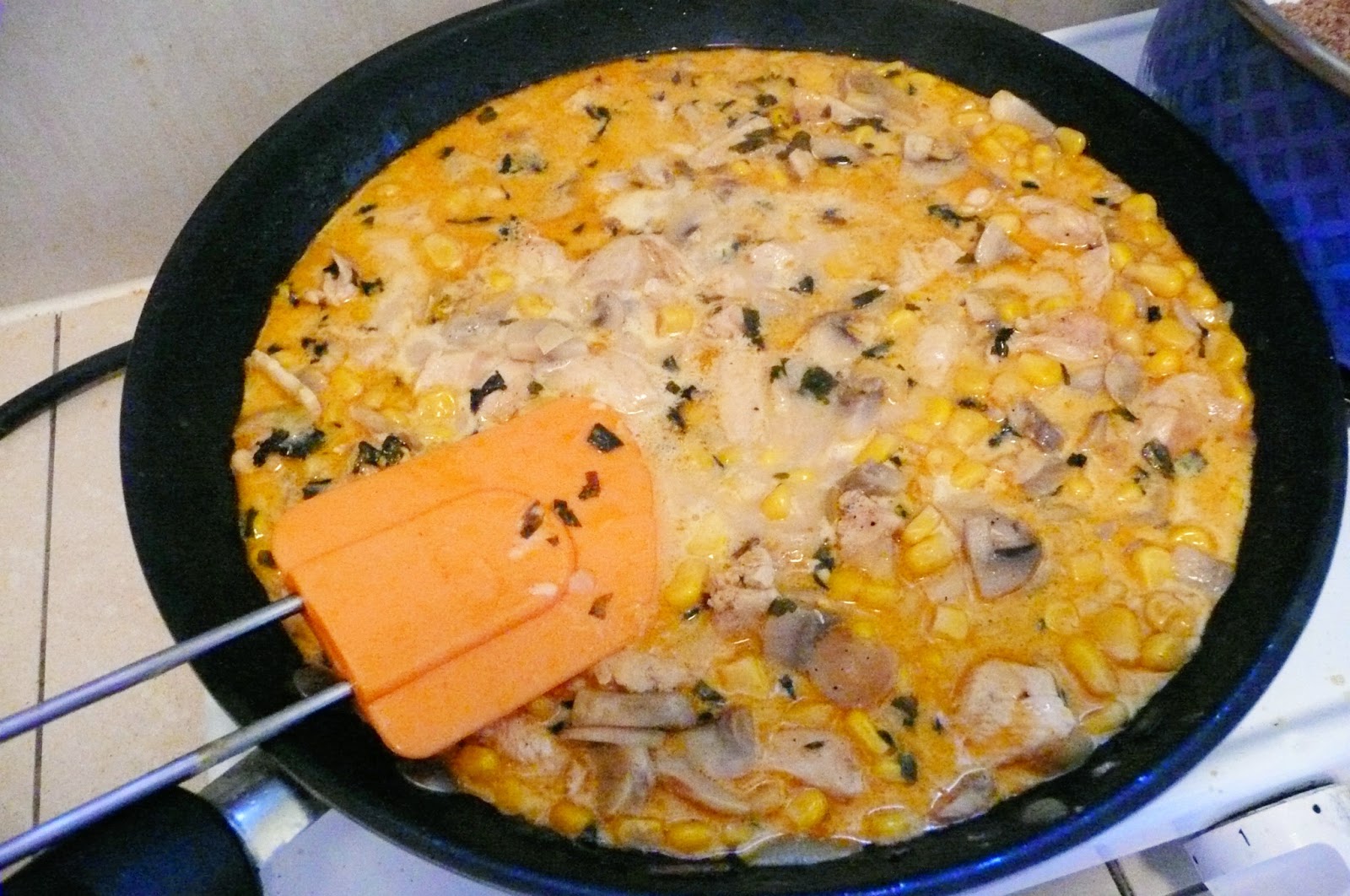 Dziś na obiad mięsko z kurczaka w sosie śmietanowym, z pieczarkami i kukurydzą.Niby nic "wielkiego" ani nowego, ale całość dopełnia kasza Pesso, w której ja i mój chłopak zakochaliśmy się.