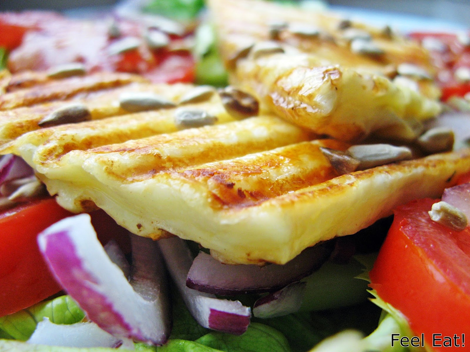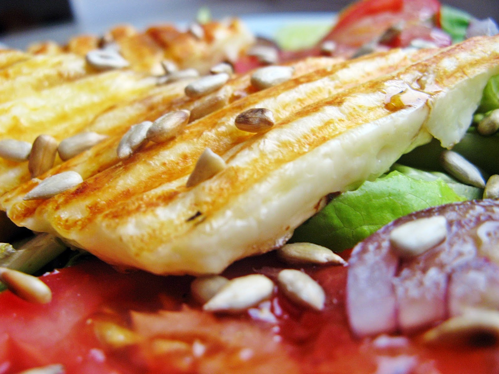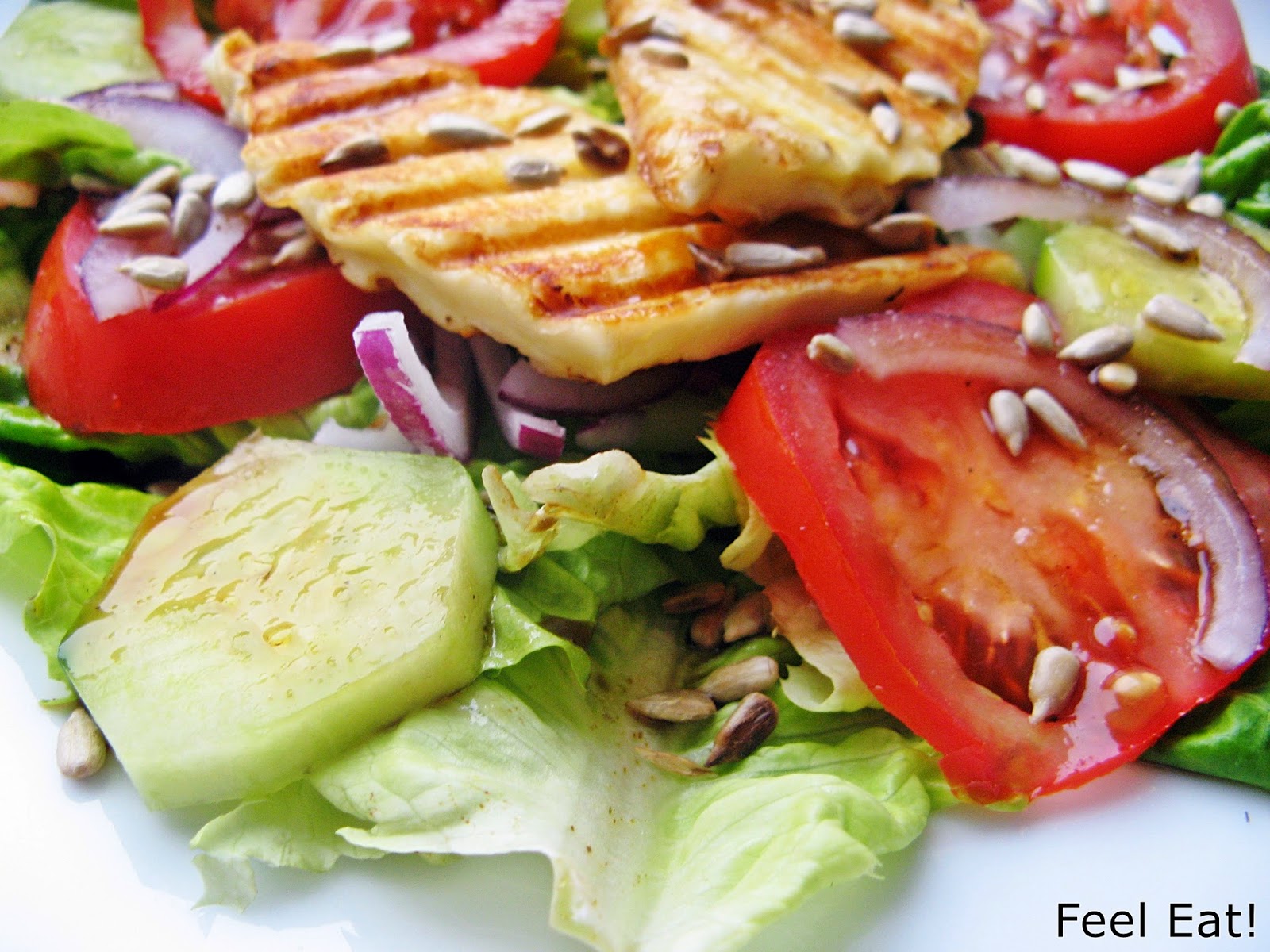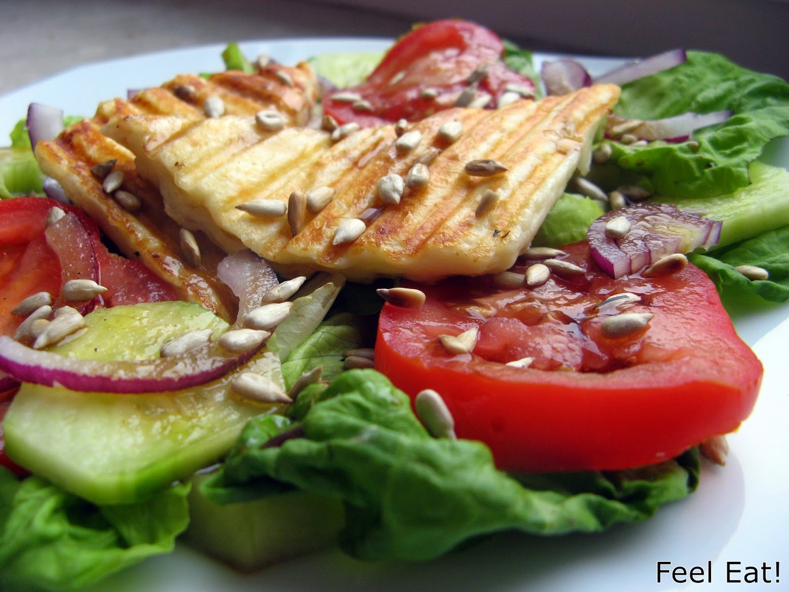 Warzywa umyć, sałatę, pokrojonego ogórka, pomidora i cebulę ułożyć na talerzu. Ser zgrillować z elektrycznym grillu, lub usmażyć na patelni teflonowej bez dodatku tłuszczu. Przygotować dressing mieszając wszystkie podane wyżej składniki, na sałatce ułożyć ser, polać dressingiem, posypać podprażonymi na suchej patelni pestkami i od razu podawać.