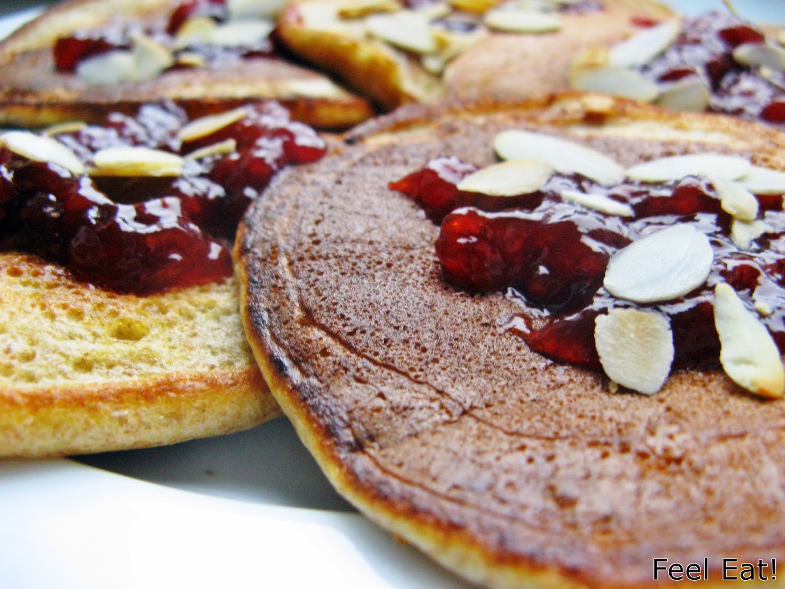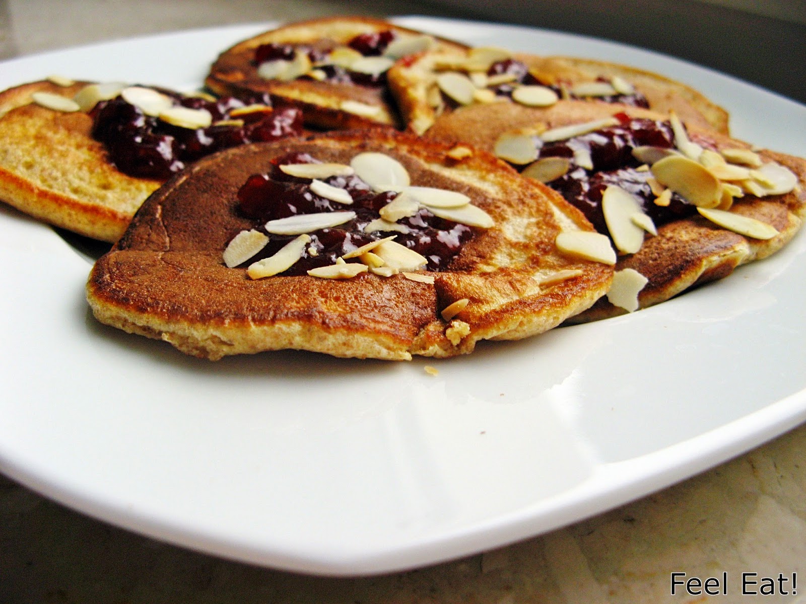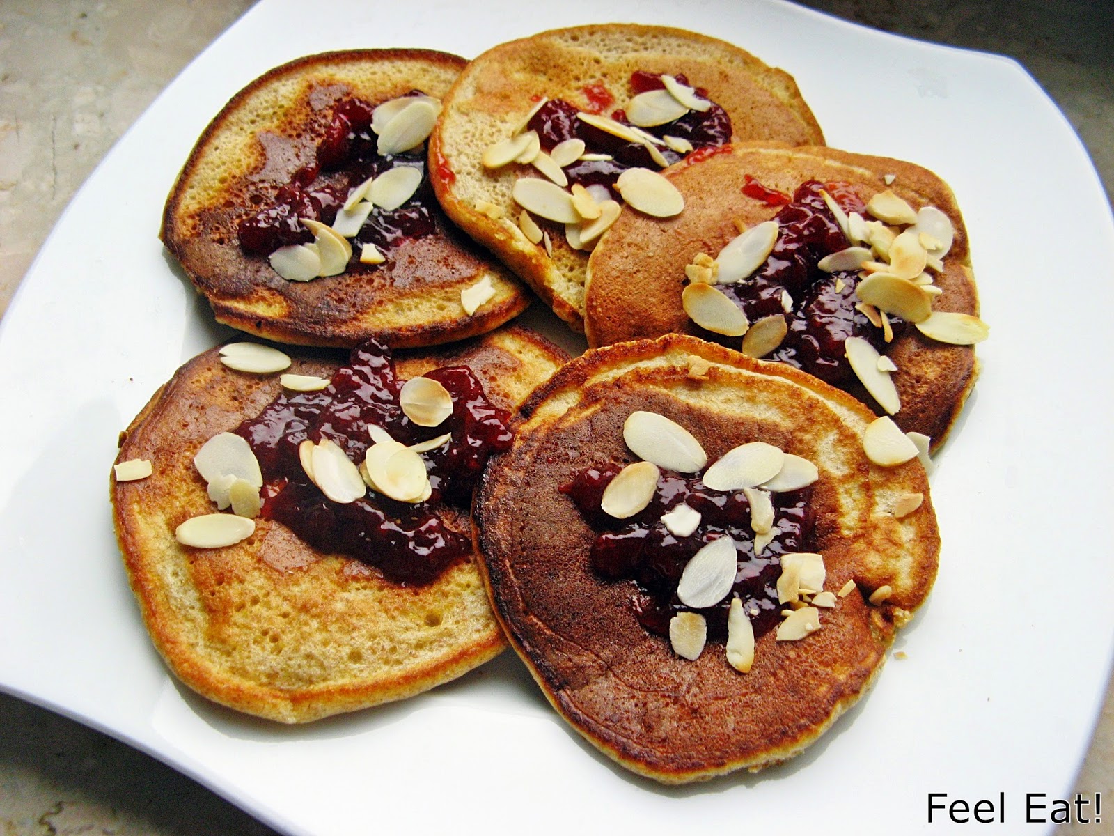 Białko ubić z dodatkiem soli na sztywną pianę. W oddzielnej misce roztrzepać mikserem żółtko, cukier, pół szklanki mleka i mąkę pełnoziarnistą. Płatki migdałowe podprażyć na suchej patelni, uważając, by się nie przypaliły. Białka dodawać delikatnie łyżką do roztrzepanej mikserem masy. Nakładać łyżką porcje ciasta na nagrzaną patelnię teflonową (jeśli jest już trochę zużyta, należy dodać trochę tłuszczu), z jednej strony smażyć pod przykryciem, przewrócić na drugą stronę drewnianą łopatką i już nie przykrywać patelni pokrywką. Przełożyć placki na talerz. nałożyć na nie dowolną ilość dżemu i posypać wszystko wcześniej uprażonymi płatkami migdałowymi.