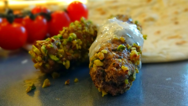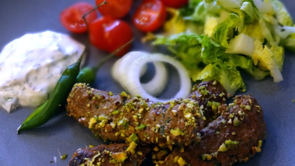- Jeśli chcemy kebaby robić na patyczkach, należy je namoczyć na kilka godzin w wodzie aby mięso nie przywarło. Ja smażyłam je na patelni grillowej więc zrezygnowałam z patyczków. Kebaby grillować po kilka minut z każdej strony, uważając aby mięso zbyt nie wyschło. Usmażone mięso obtaczać w posiekanych pistacjach i podawać z sosem jogurtowym. Pycha!