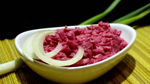 Sałatka z buraczków konserwowych jest jedną z moich ulubionych sałatek - delikatnie pikanta, wyraźna w smaku i mimo, że jest doprawiona majonezem zachowuje lekkość i wiosenny charakter. Uwielbiam jej prostotę - kilka składników, piętnaście minut na wykonanie, a smak napewno zaciekawi niejednego z Was.