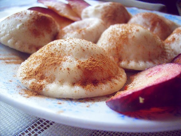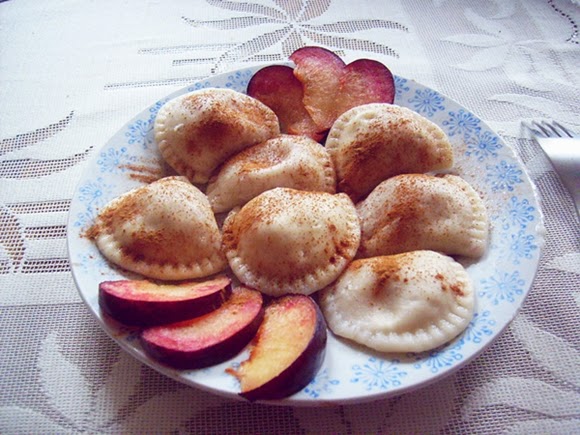 Pierogi z serem i truskawkami, z cynamonem i śliwką; kakao