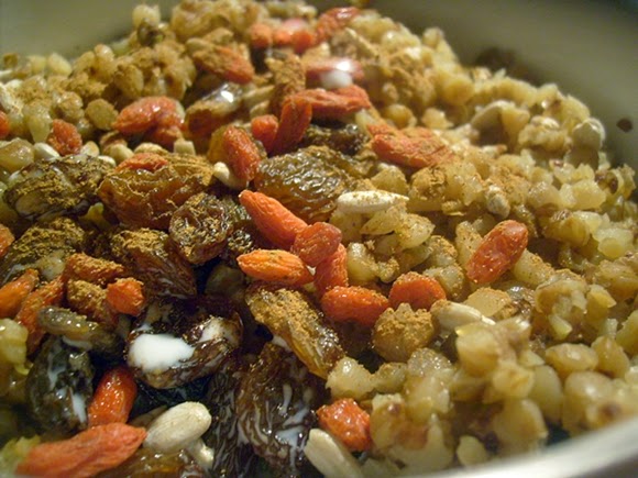 | Kasza gryczana gotowana na mleku z rodzynkami, jagodami goji, pestkami słonecznika i cynamonem |