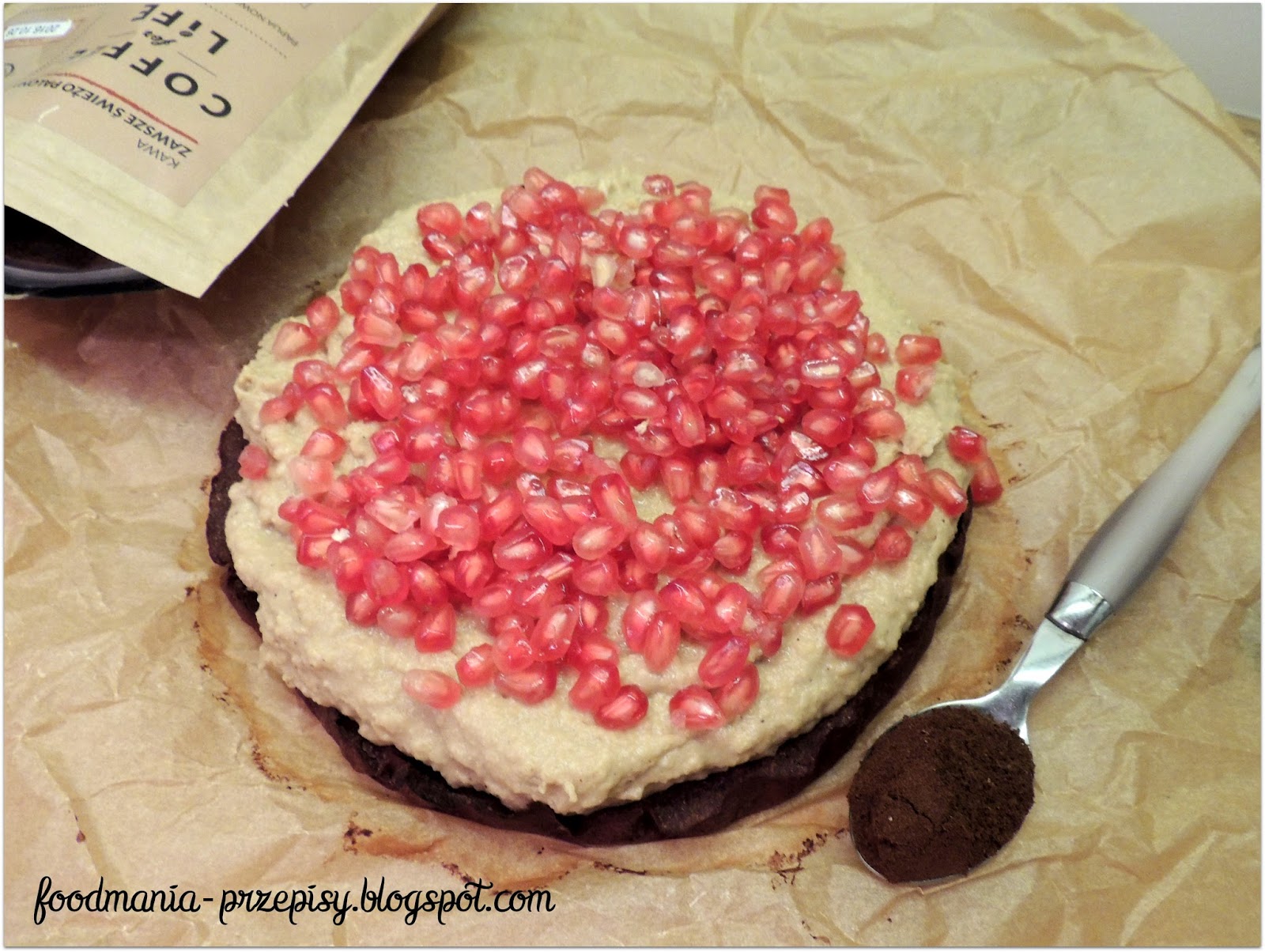 - Ugotowaną i ostudzoną kaszę zblenduj z masłem orzechowym i miodem- krem wyłóż na wcześniej upieczony spód, całe ciasto posyp ziarenkami granatu.