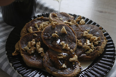 Dyniowo-cynamonowe placki. Polane miodem i posypane orzechami włoskimi + kakao dyniowe*