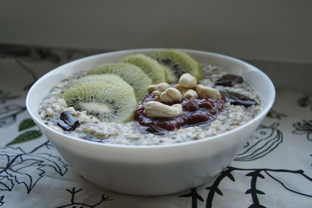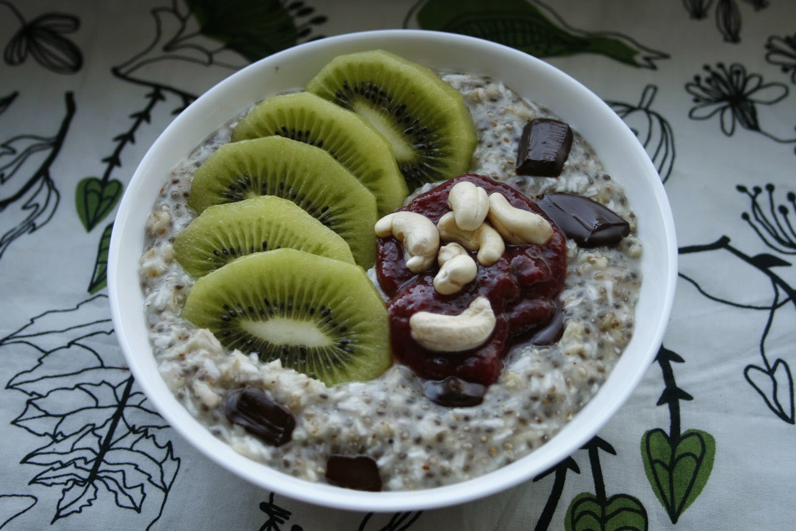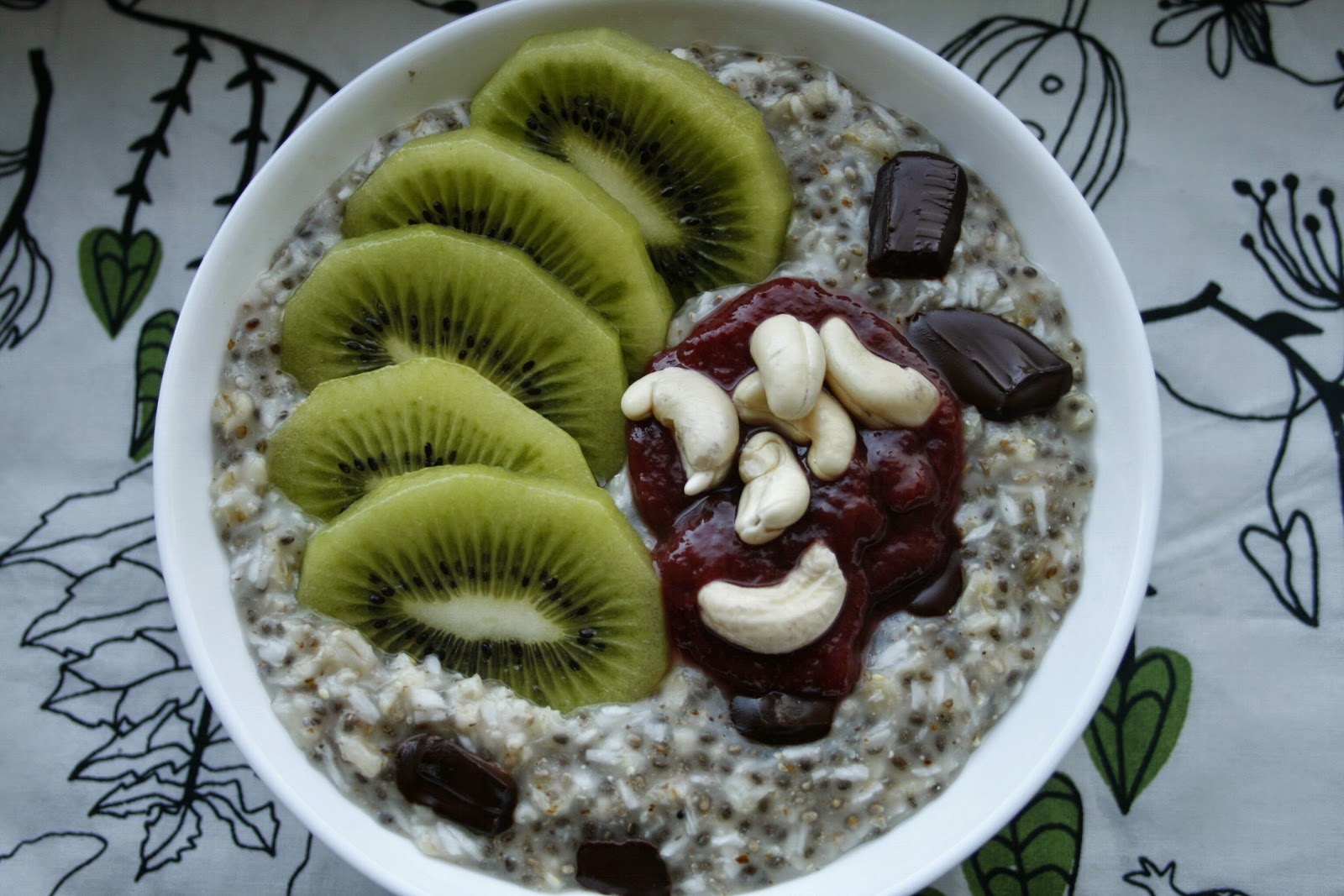 Owsianka na wodzie gotowana z nasionami chia i wiórkami kkokosowymi. Podana z kiwi, namoczonymi na noc nerkowcami, gorzką czekoladą 74% i z babcinym muso-dżemem (<3) malinowym.