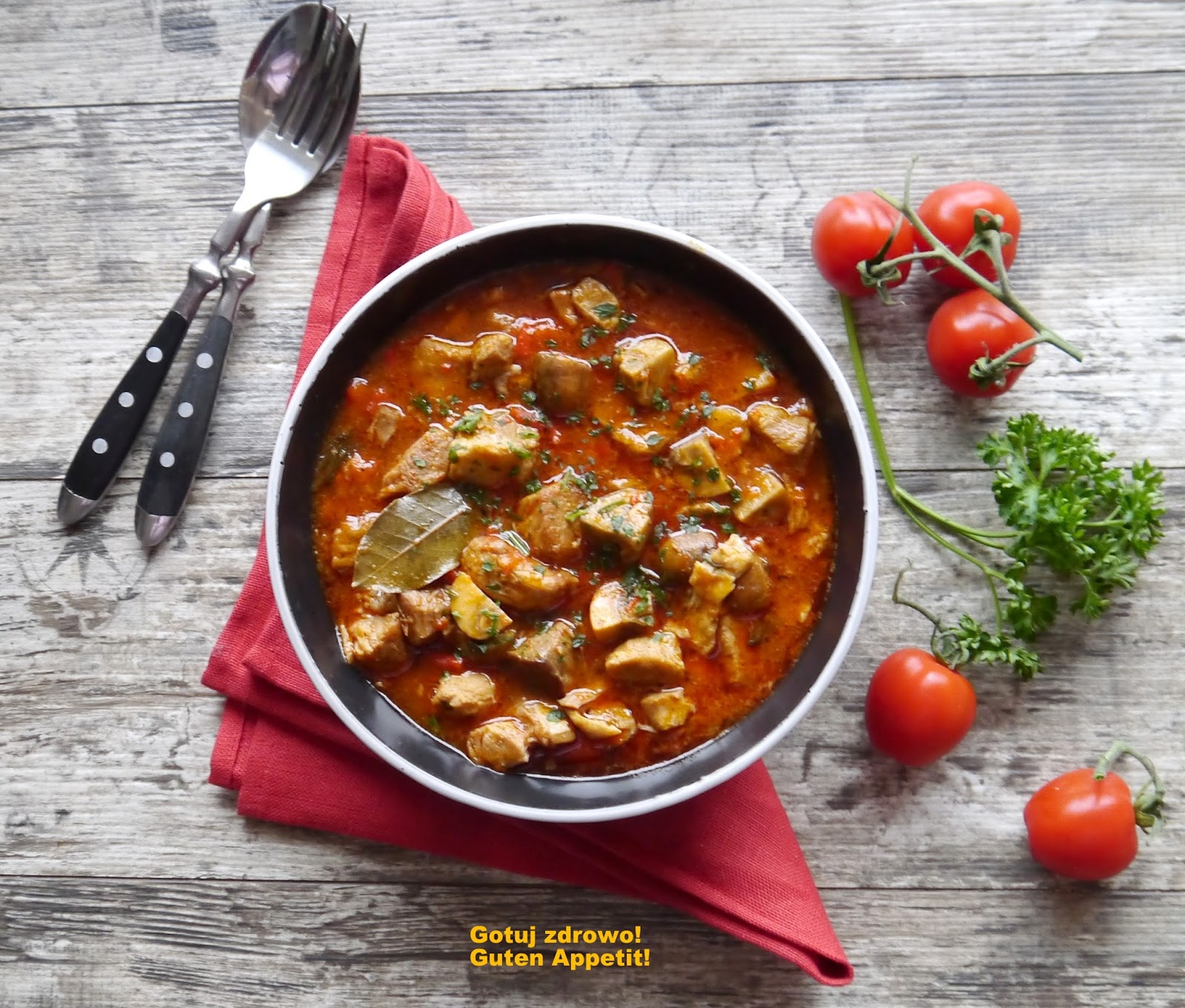 Pikantny gulasz pomidorowy z karczku to typowy zimowy posiłek. Już samo mięso, nie należy do dietetycznych, jest pożywne i syte, a przyprawy działają przyjemnie rozgrzewająco.