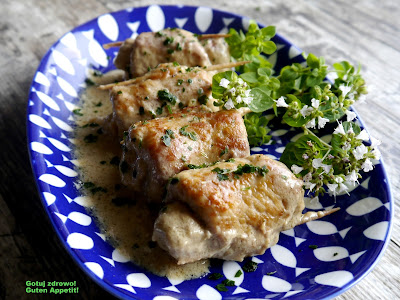 - schab pociąć w 2- cm plastry. Rozbić bardzo cienko pod folią spożywczą. Mięso posolić, oprószyć pieprzem i posmarować cienko musztardą. Rozłożyć na każdym kawałku mięsa po plasterku boczku, ogórka i posypać pokrojoną w kosteczkę cebulą. Zwinąć mięso w roladkę, ufiksować przy pomocy wykałaczki