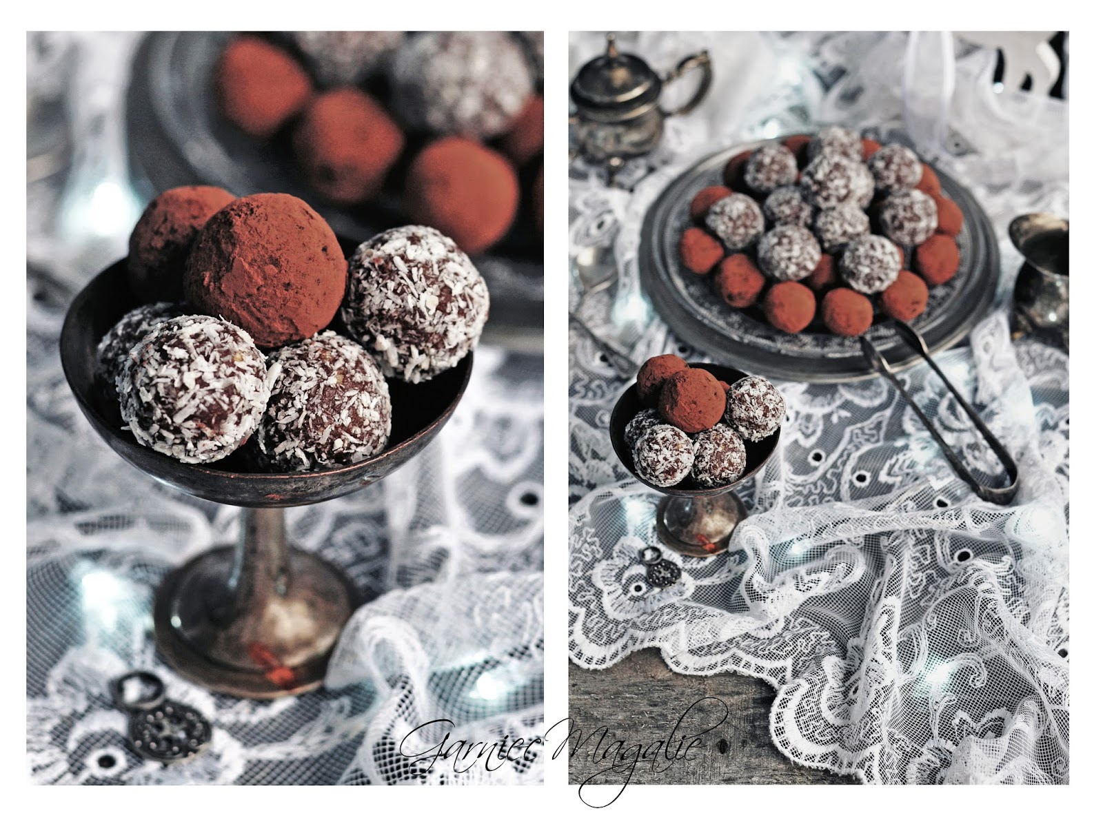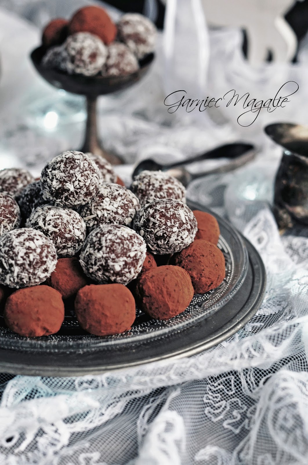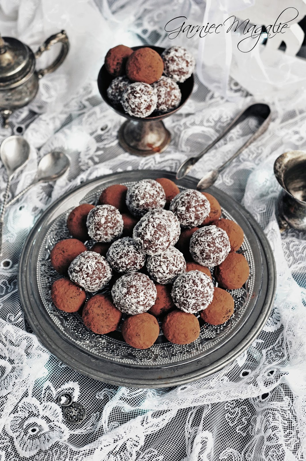 Do obtoczenia: ciemne kakao, wiórki kokosowe, posiekane orzechy lub migdały