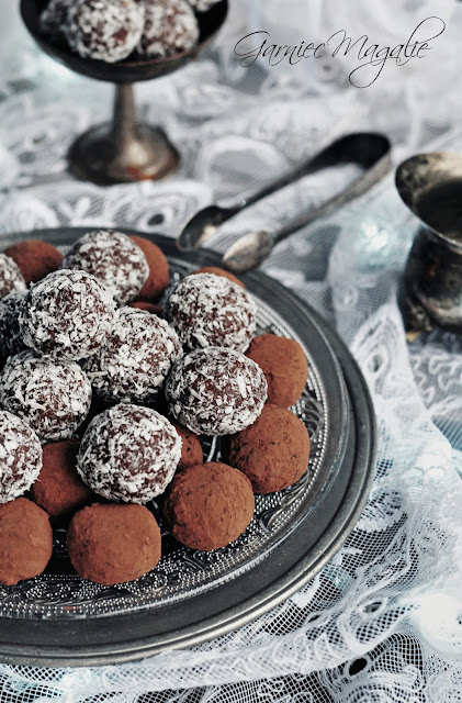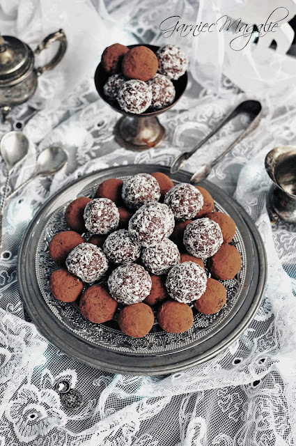 Z masy formuj zgrabne kuleczki (jak to relaksuje, ja tam lubię kulać ... :)). Następnie obtocz każdą kulkę w kakao, wiórkach lub posiekanych orzechach. Włóż do lodówki na 2 godziny. Podawaj schłodzone. Idealnie smakują zarówno do kawy jak i wszelkiego rodzaju alkoholi. Smacznego! :)