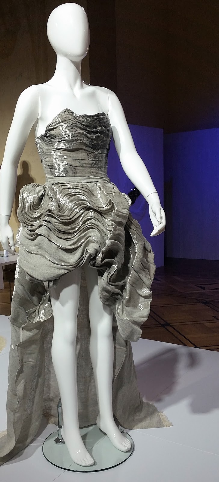 Sukienka zainspirowana metalicznymi refleksami łusek latającej ryby. Wykorzystano len, nici metalowe, włókna rybiego kolagenu.