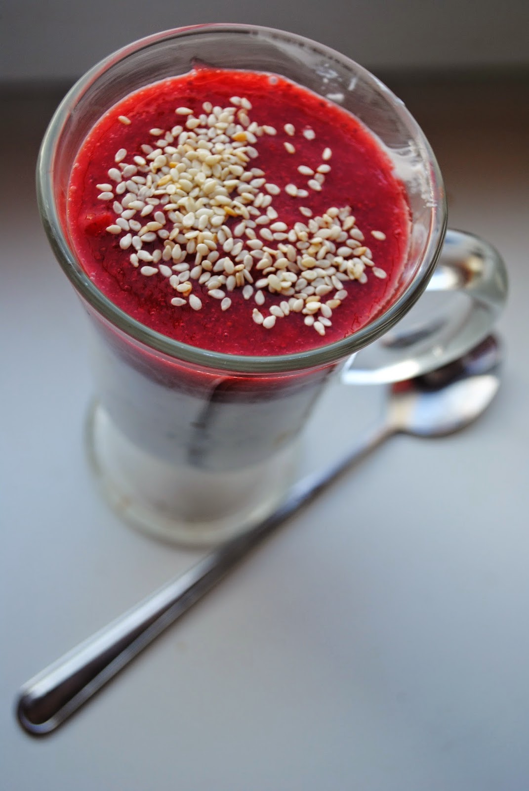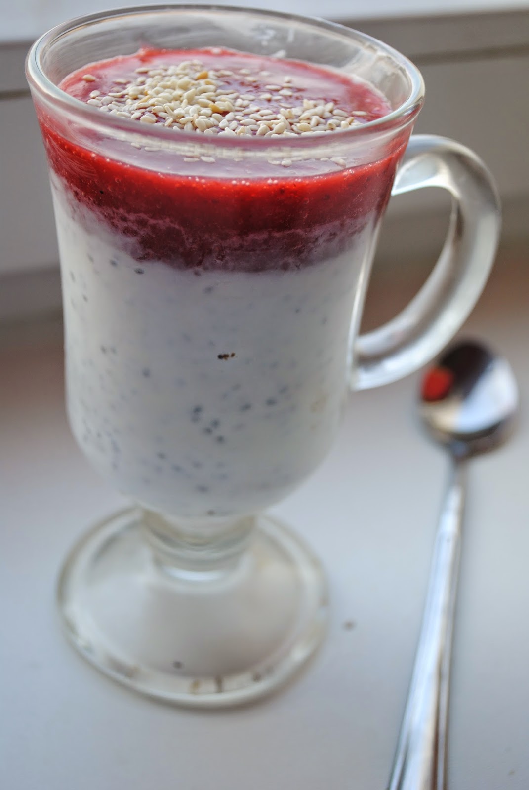 Te małe ziarenka to nasiona szałwii hiszpańskiej zwane chia. Praktycznie nie trzeba się z nimi za bardzo obchodzić, wystarczy zalać mlekiem lub sokiem, a po krótkim czasie zaczną żelować konsystencje, w której zostały namoczone. Zmieszałam je z rozmrożonymi truskawkami i jogurtem.Kocham takie owocowe śniadanka , Jak wiemy nasiona chia :