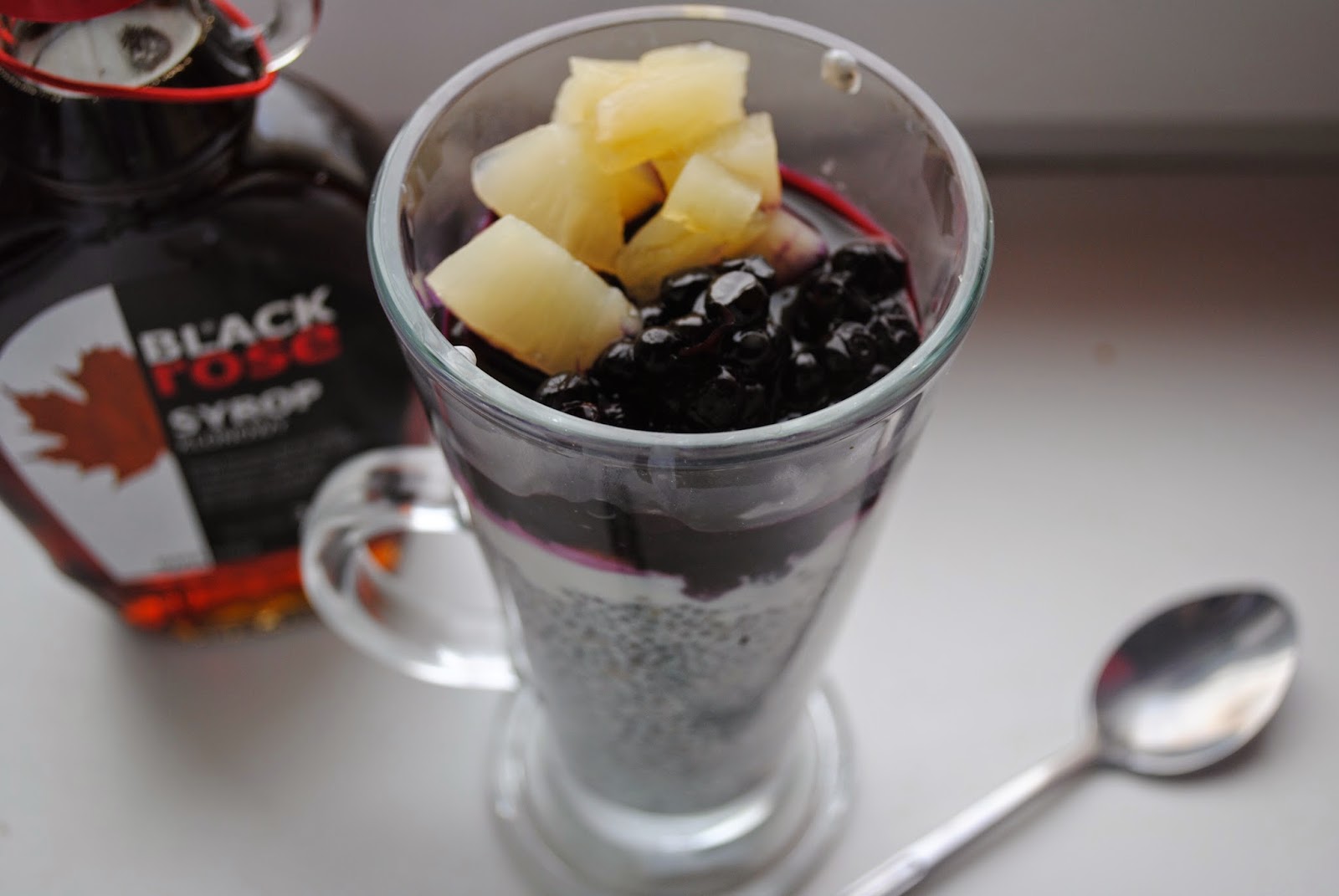 Nasiona chia zalewamy mlekiem i mieszamy, odstawiamy na noc do lodówki. Kroje ananasa ,wrzucamy jagody . Do naczynia w którym będziemy podawać pudding nakładamy część nasion, następnie mus jagodowy i ananas .