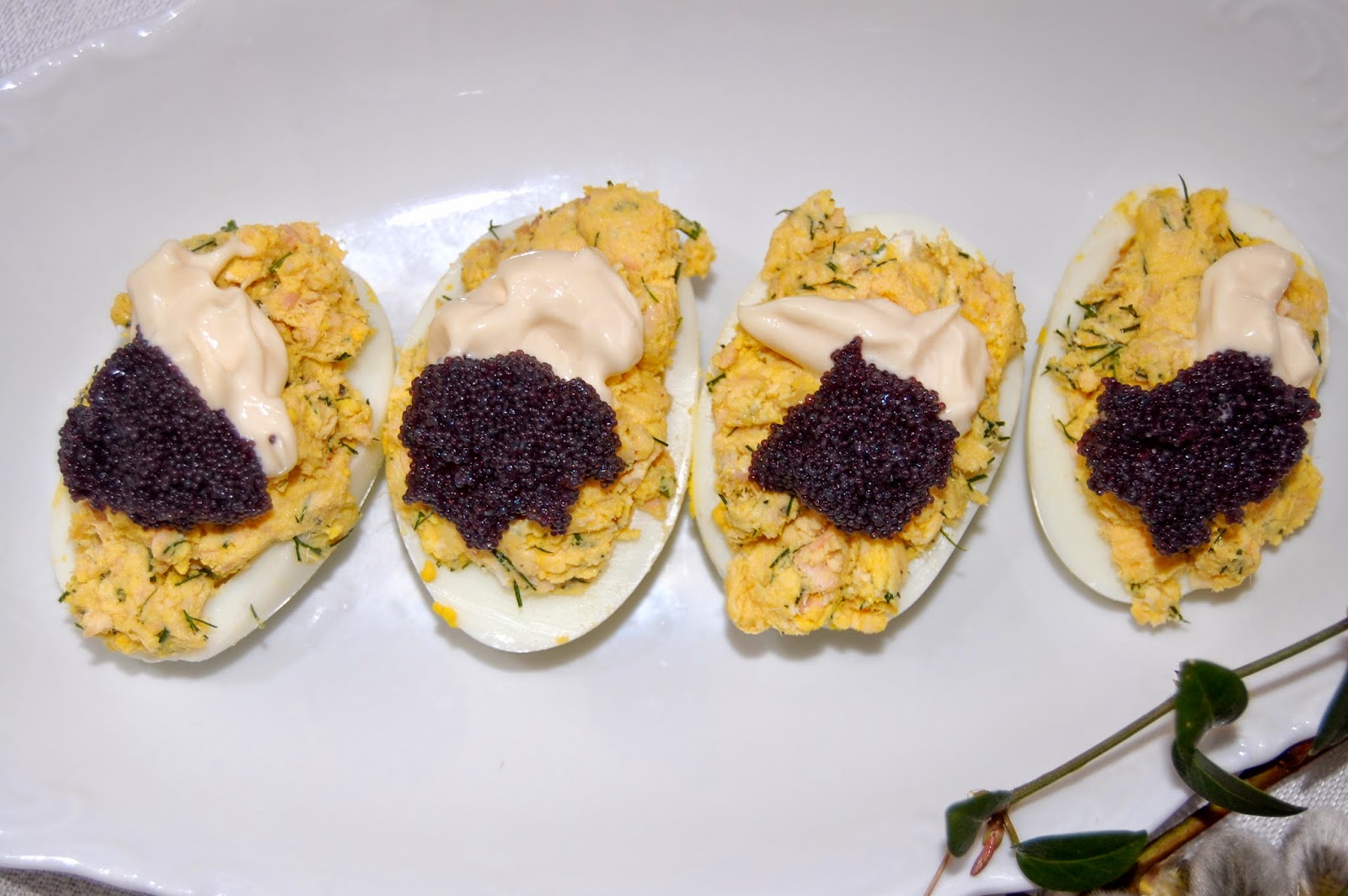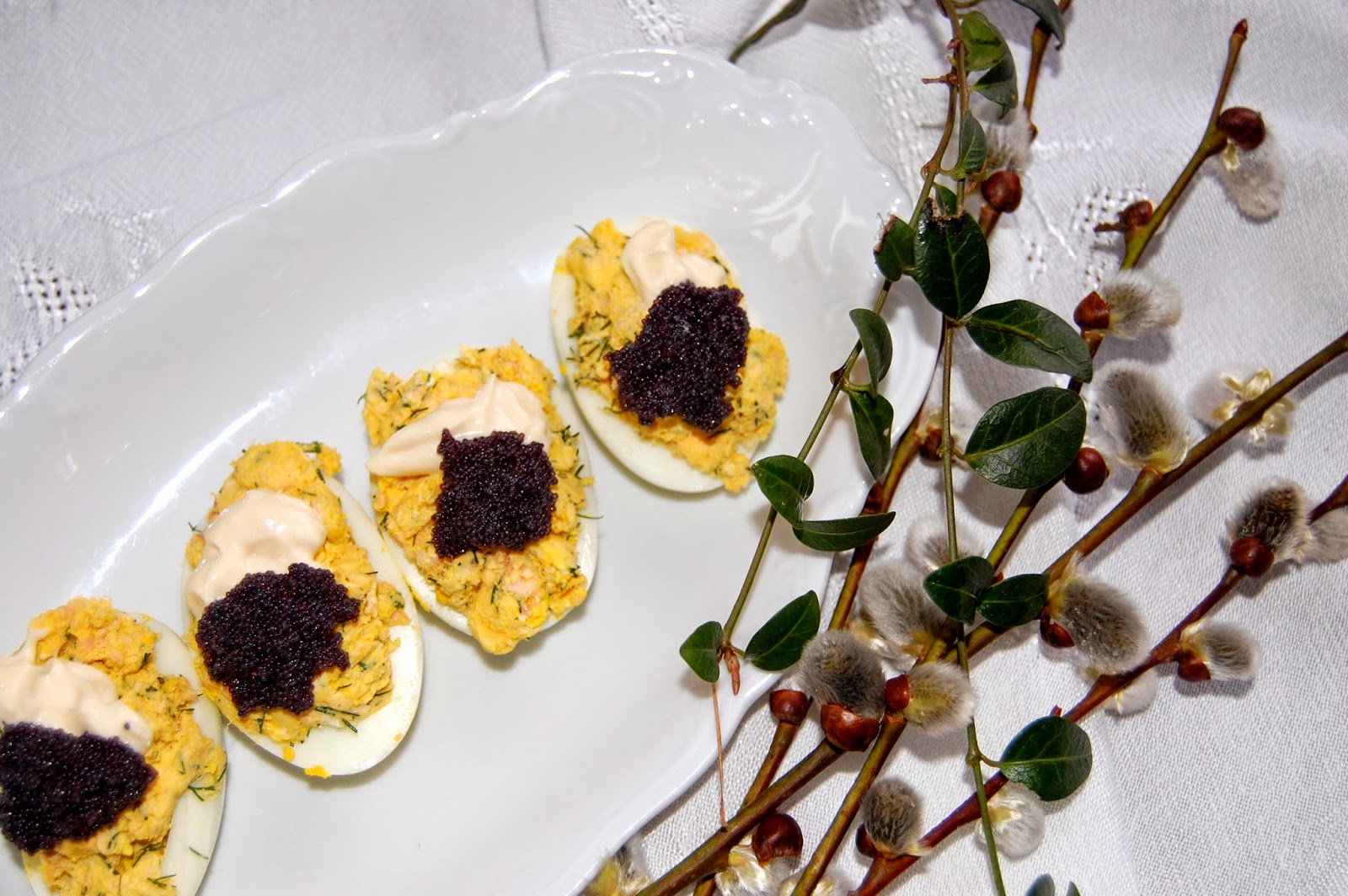 Wiem, spóźniłam się.Święta już dawno minęły, a ja Wam tu serwuje jajka faszerowane..Jednak znam ludzi, którzy degustują tego typu jaja cały rok, więc a nóż widelec ..?A jak nie, to wykorzystacie przepis za rok :) !JAJKA FASZEROWANEKAWIOREM I ŁOSOSIEM(n...