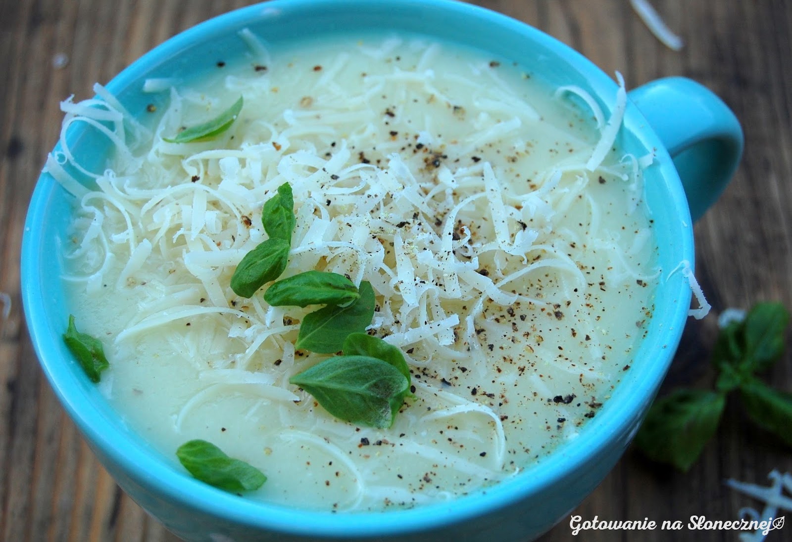 Zupę podajemy w miseczkach posypaną startym serem i świeżymi listkami bazylii.