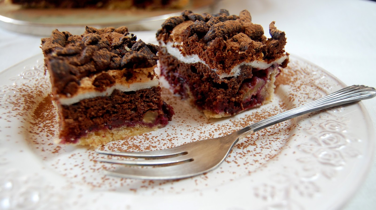 Na tarce o dużych oczkach ścieramy jedną część kakaowego ciasta. Schłodzone białka ubijamy na sztywną pianę, pod koniec ubijania dosypujemy partiami cukier i jeszcze chwile ubijamy - piana musi błyszczeć. Pianę układamy na kakaowe ciasto i na nią ścieramy trzecią część ciasta. Pieczemy w temperaturze 180 stopni przez 35-40 minut.