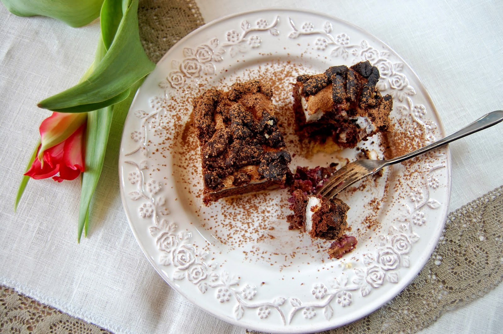 Ostudzone ciasto posypujemy ciemnym kakao lub startą na tarle gorzką czekoladą - pycha !
