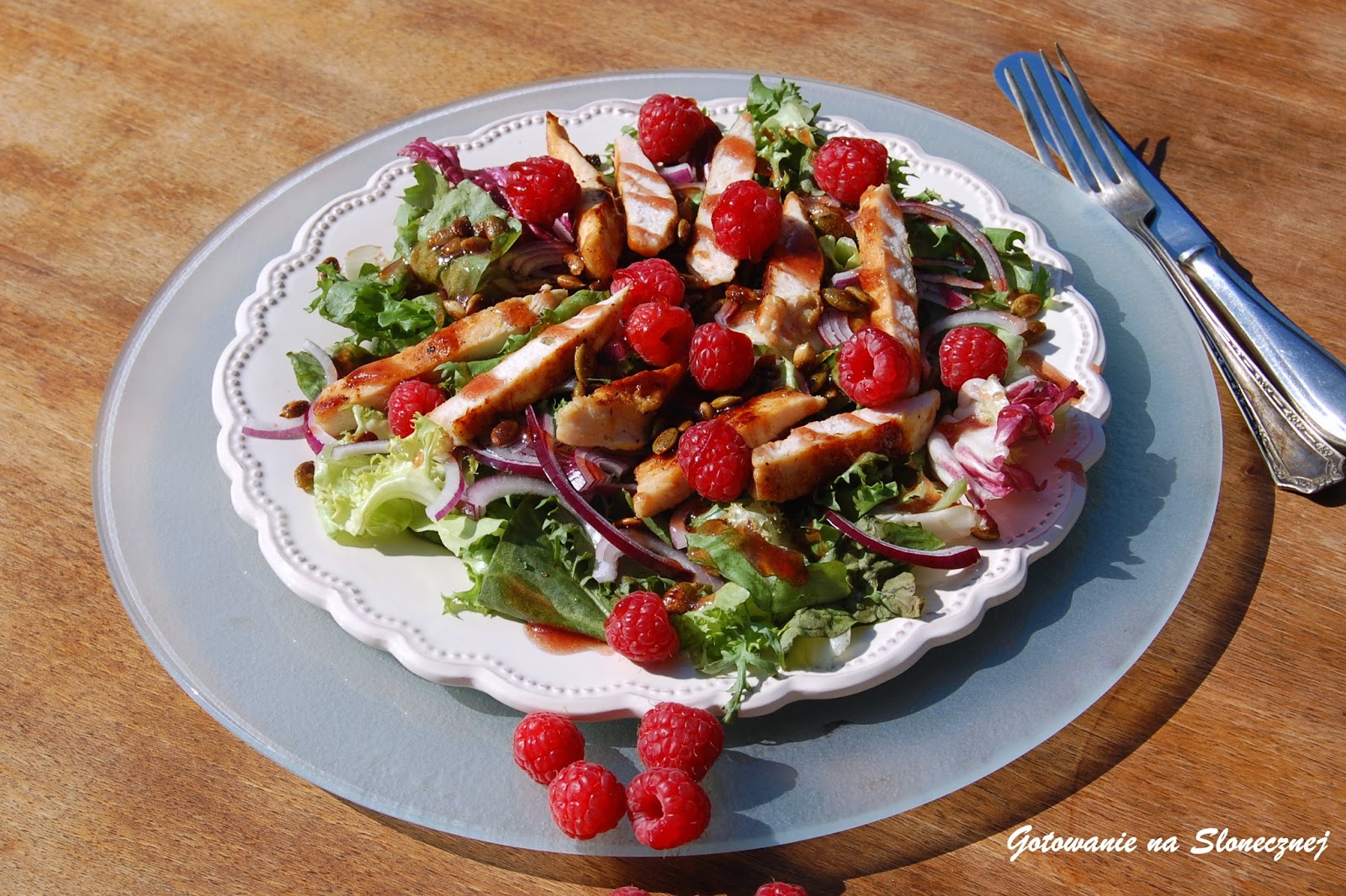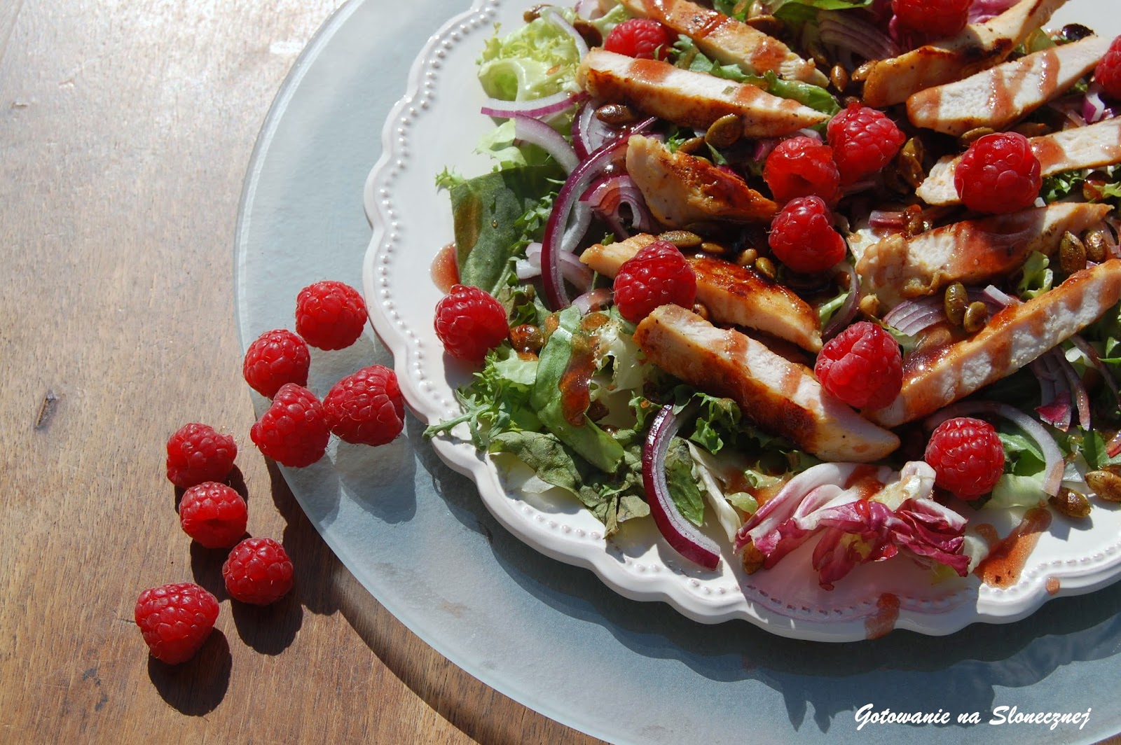 Na talerzu układamy sałatę, cebulę, kawałki kurczaka, posypujemy pestkami dyni .