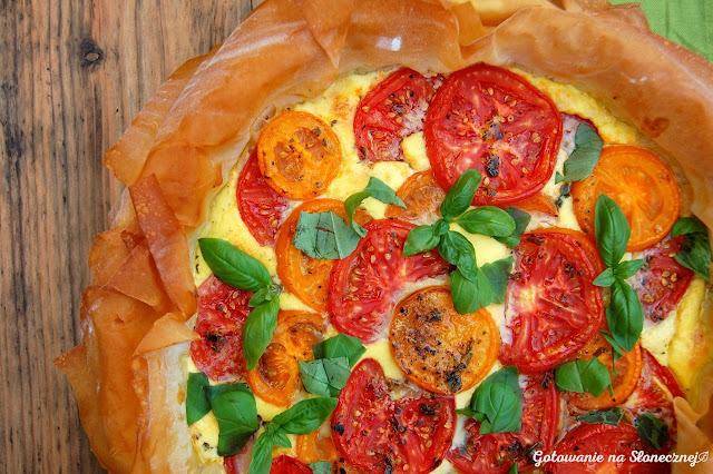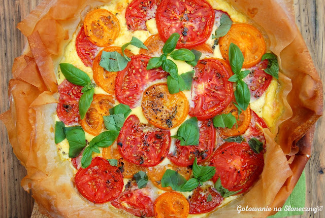 Na tak przygotowane ciasto wylewamy masę jajeczno-serową. Na równo rozprowadzonej masie układamy gęsto plastry pomidorów.