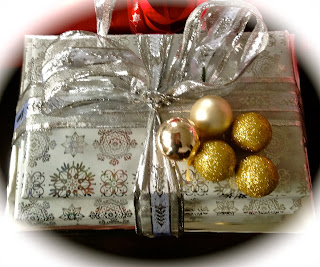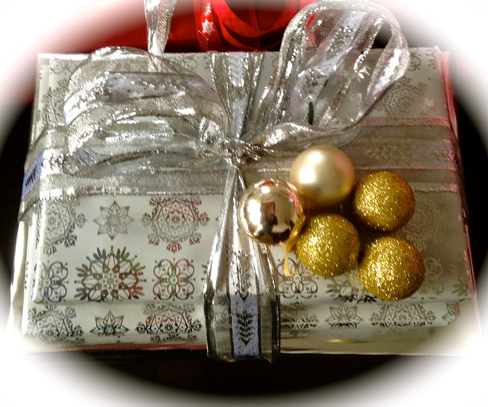 Bardzo lubię do złożonych z kilku prezentów stosować przezroczyste folie z motywem świątecznym: