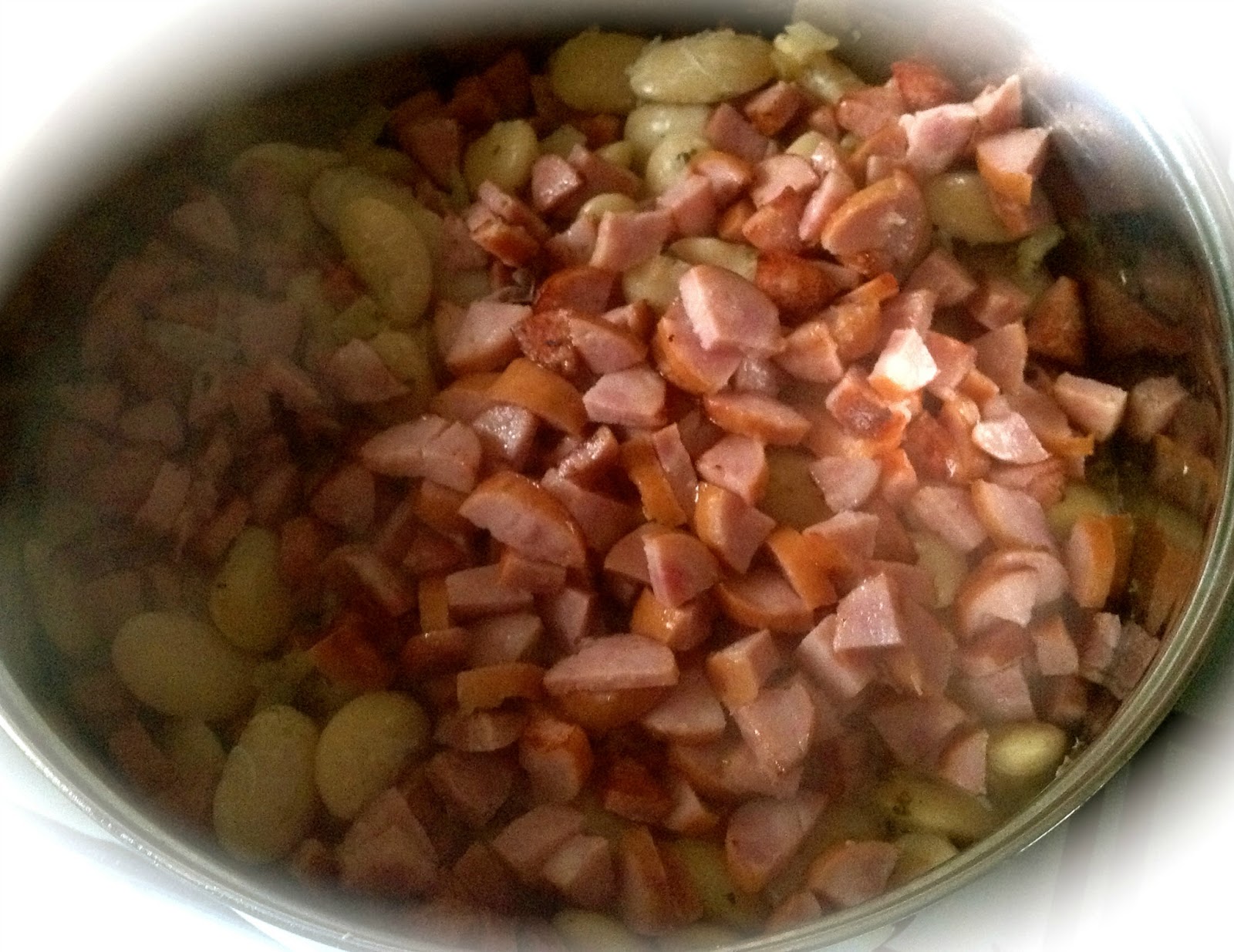 5. Podsmażoną kiełbaskę wrzucamy do garnka.