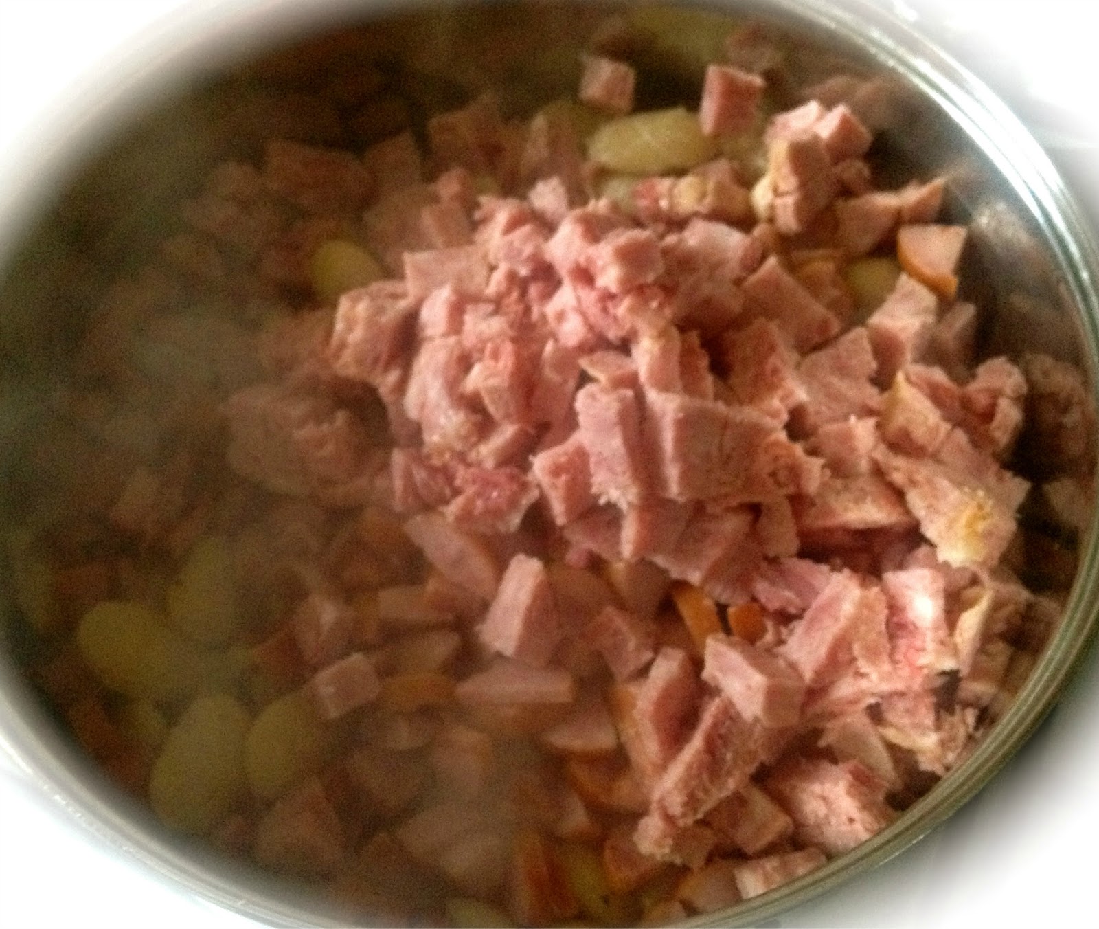 6. Gulasz angielski kroimy w kosteczkę i również wrzucamy do garnka z fasolą. Dużo lepiej smakuje z konserwą. Jest lepszy zapach i smak.