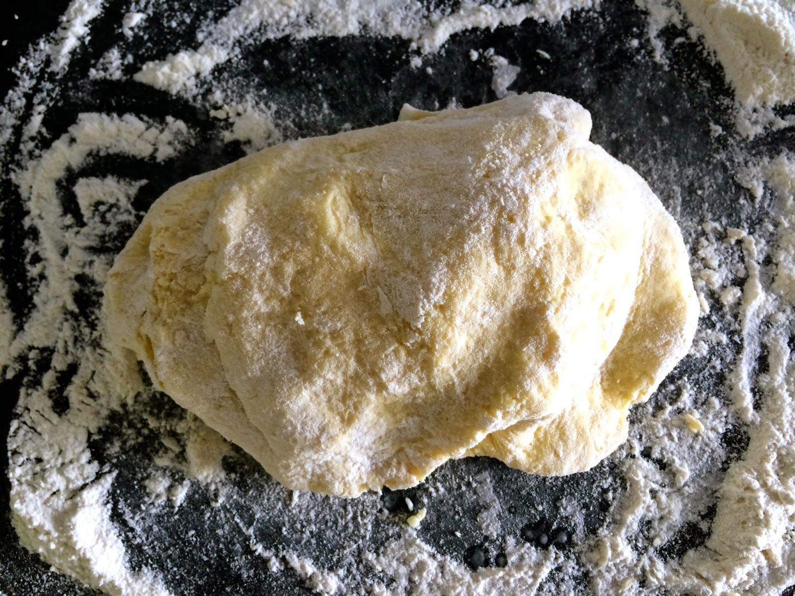 7. Z ciasta przygotowujemy grupy rulon, który kroimy na grube paski.