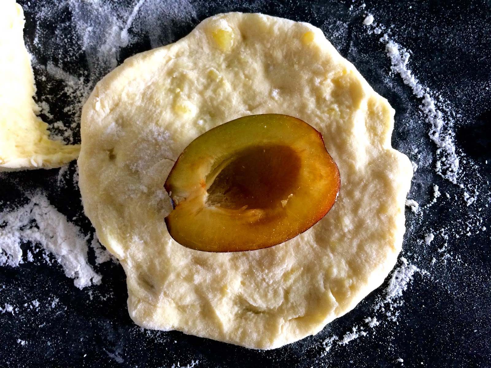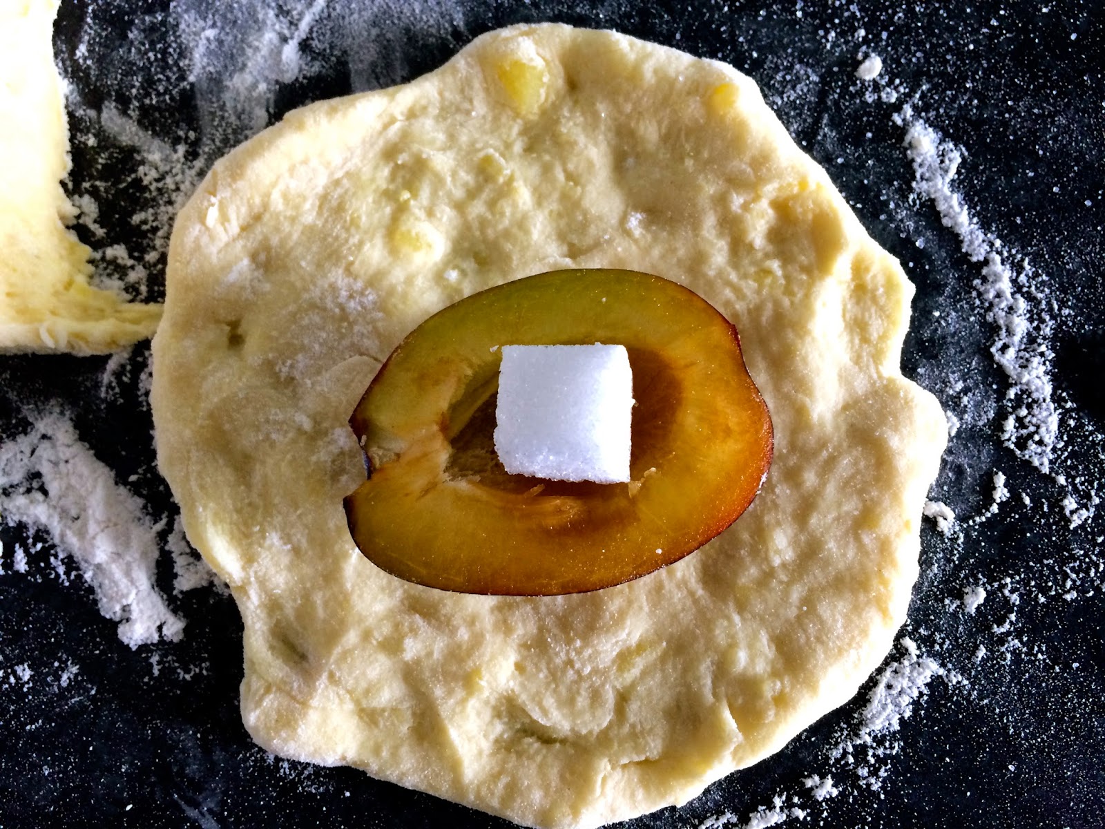 9. Z ciasta robimy płaskie placki, na środek kładziemy połowę śliwki i kostkę cukru, posypujemy cynamonem.