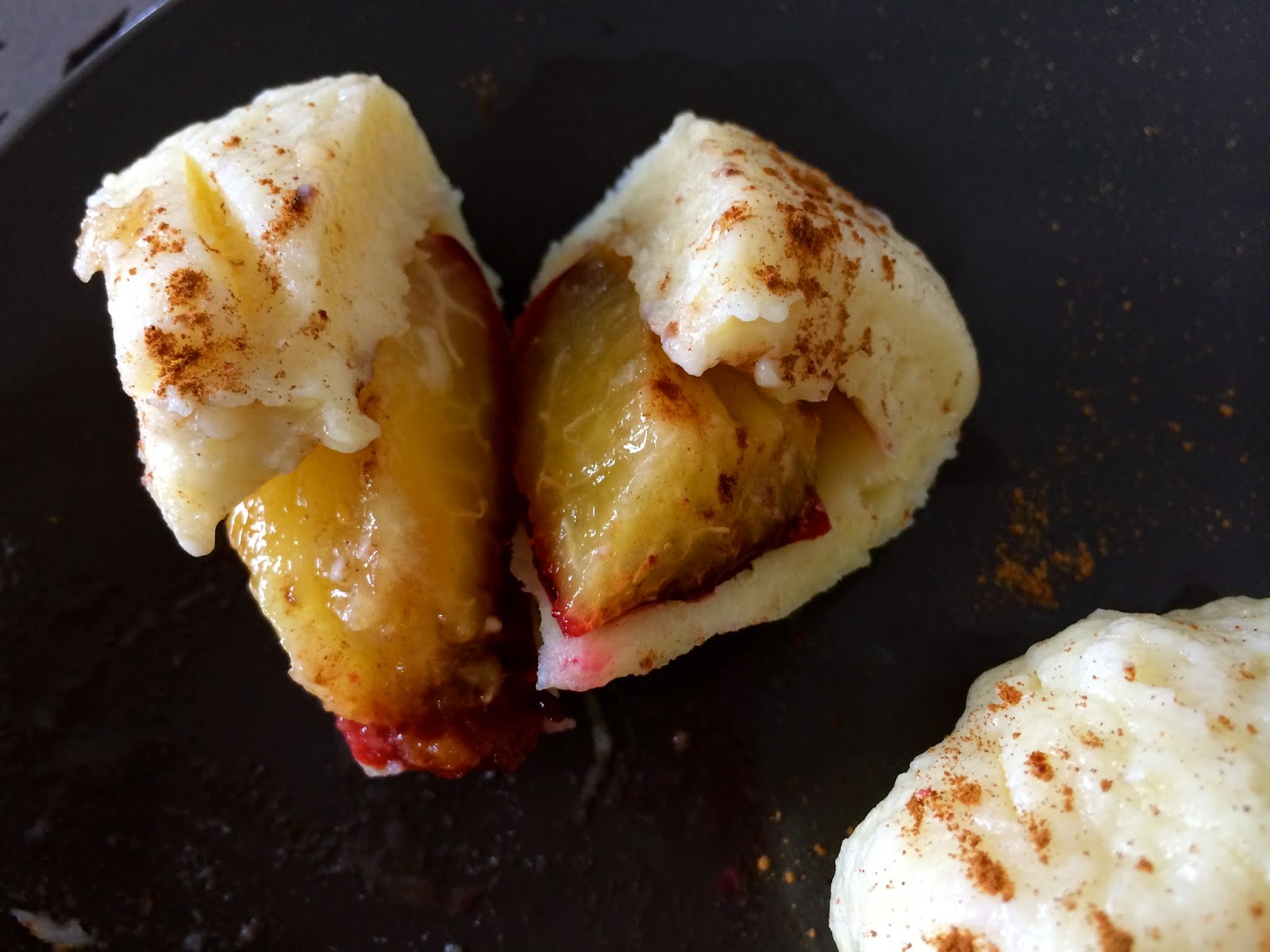 Stałam zmieszana, brać, czy nie brać oto jest pytanie? Dylemat ogromny w moim życiu na urlopie macierzyńskim się pojawił. I oto cud! Na najniższej półce i na dodatek z tyłu leżała całkowicie opuszczona polska śliwka. Uśmiech mi wrócił, powiedziałam: ,,Synu będą knedle!". W szale wybrałam największe, wręcz ogromne i piękne śliwki i pobiegałam do domu. Mój syn jak nigdy był tak zmęczony, że spał 3 godziny. Nigdy mu się to nie zdarza, on regeneruje siły w 20 minut. Dziecko to najlepszy akumulator świata, krótko się ładuje, a na długo starcza. Grzeczny synuś dał mamie zrobić caluśki obiad i jeszcze go zjeść. Chyba ten spacer po sadzie... tfu sklepie w poszukiwaniu śliwek tak go spompował. Knedle to naprawdę bardzo prosta robota, a ja z tym moim roztargnieniem znacznie sobie utrudniłam sprawę. Dopiero jak zaczęłam owijać śliweczki w ciasto zrozumiałam jaki błąd w tym sadzie... tfu... sklepie popełniłam. Z całej porcji ciasta wyszło mi 10 ogromnych knedli, wielkich jak jabłka. Ledwo udało mi się owinąć te śliwki. Dzwonię w między czasie do mojego Szanownego męża: