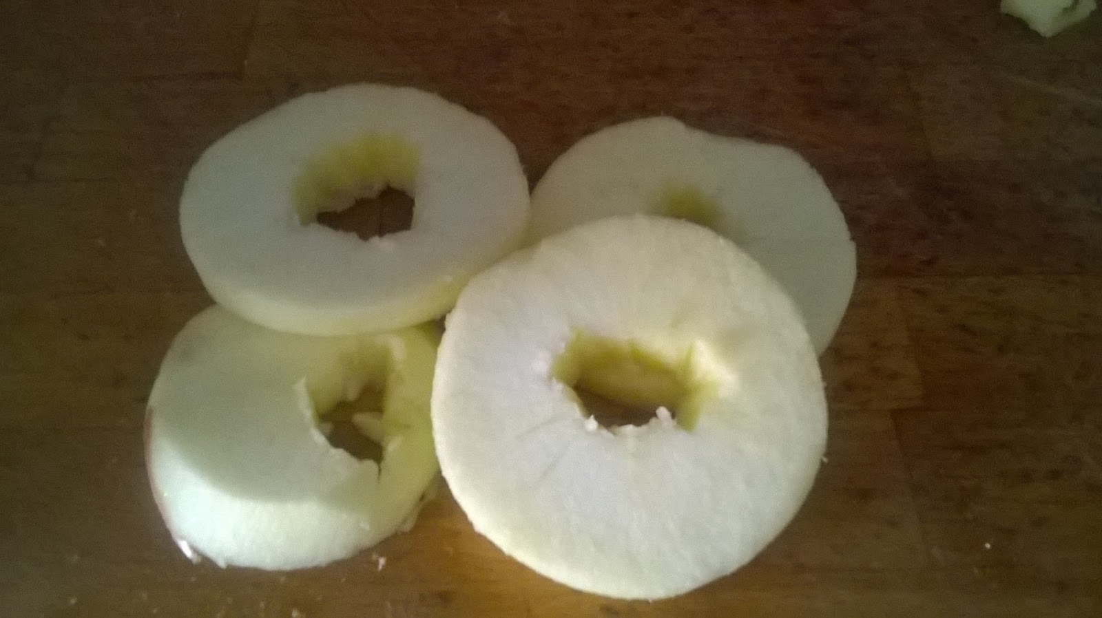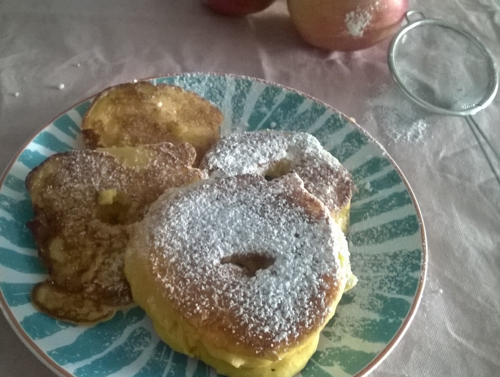Aby powstały mi ładne dziurki w środku, wyjmuje jabłka z ciasta na palcu i układam na patelni ;) Równie dobrze, można nadmiar ciasta zgarnąć patyczkiem do szaszłyka ;)