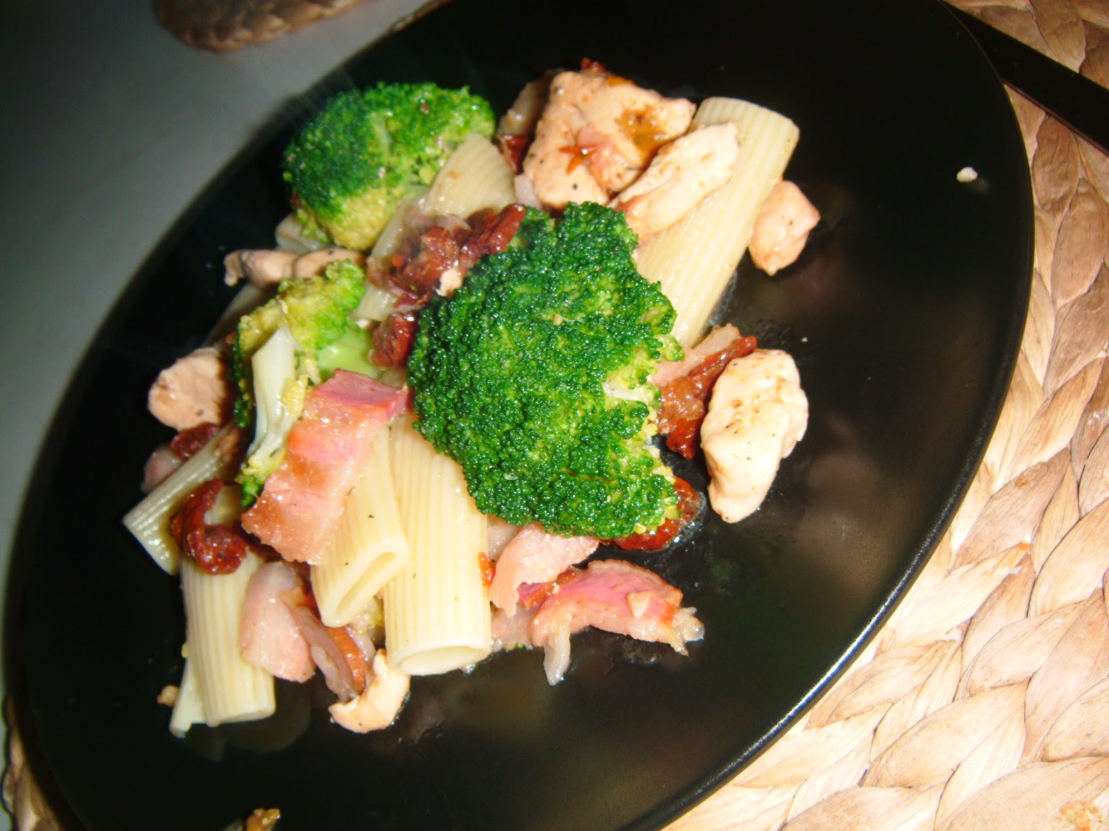 350 g makaronu np. pennekilka różyczek brokułpodwójny filet z kury6 cienkich plasterków boczku2 ząbki czosnku8-10 suszonych pomidorów4 łyżki oleju rzepakowego100 ml soku pomarańczowego1 łyżeczka czerwonego marynowanego pieprzu2-3 gałązki tymiankusól, pieprz