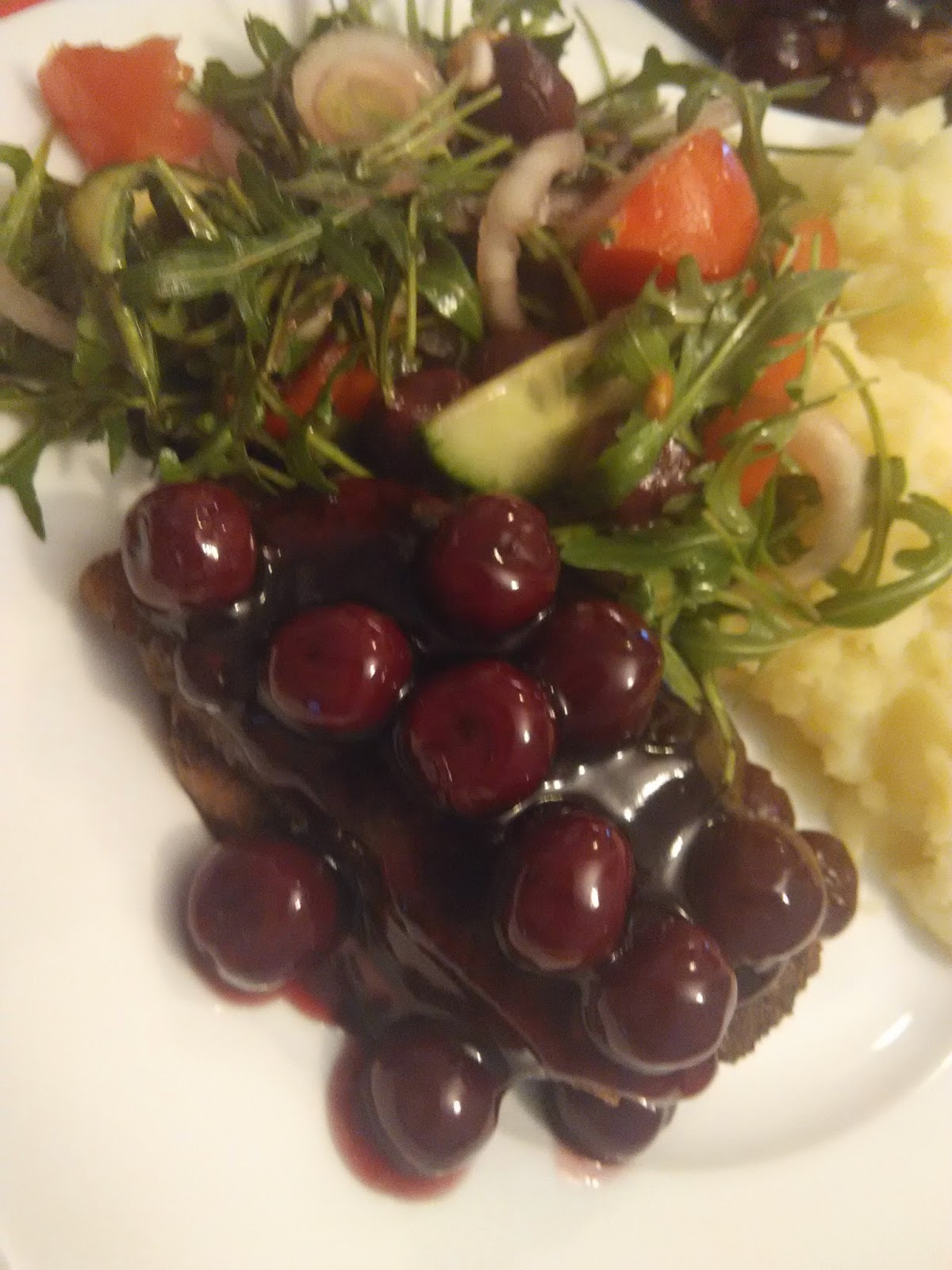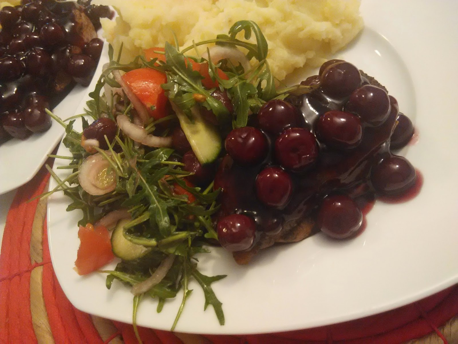Piersi układany na talerzu i polewamy sosem. Podałam je z pure ziemniaczanym i sałatka z roszpunki, ogórka zielonego, pomidora i polanej sosem wiśniowym.