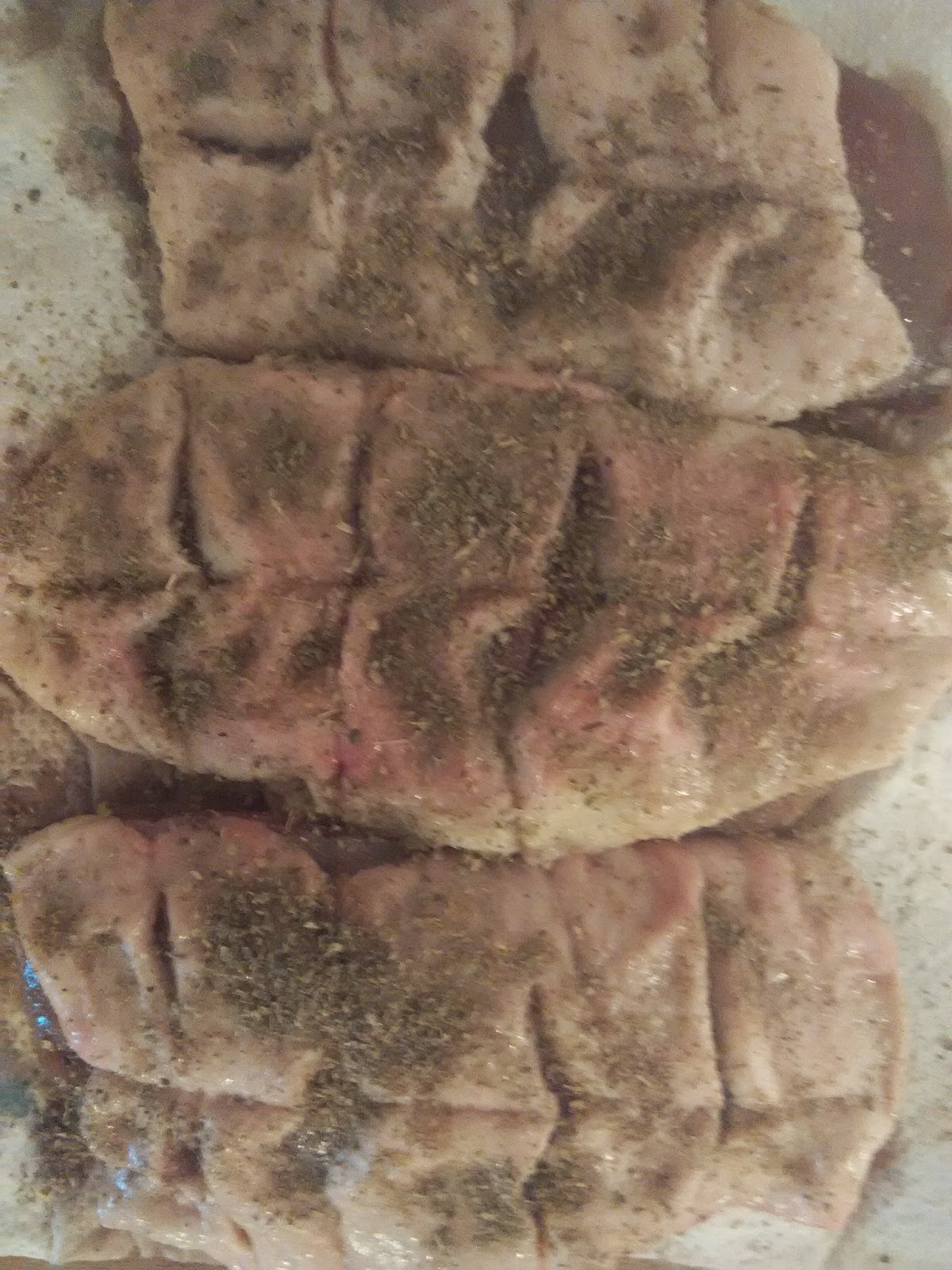 Skórkę nacinamy wzdłuż i wszerz, ostrożnie, żeby nie naciąć mięsa. Posypujemy solą i roztartym w palcach majerankiem. Smażymy na suchej patelni od strony skórki, aby się wytopił tluszcz, a skórka była rumiana. Następnie odwracamy i podsmażamy. Wykładamy piersi do naczynia zaroodpornego i podlewamy tłuszczem wytopionym ze skórki. Pieczemy w 180 stopniach C przez 40 minut na grzalce góra - dół.