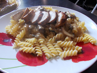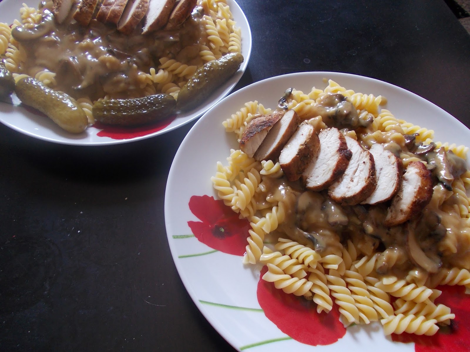 Na talerzach układam kolejno: makaron, sos pieczarkowy, a na wierzchu filet z indyka pokrojony w plastry. Ja podałam z polskimi ogórkami konserwowymi:)