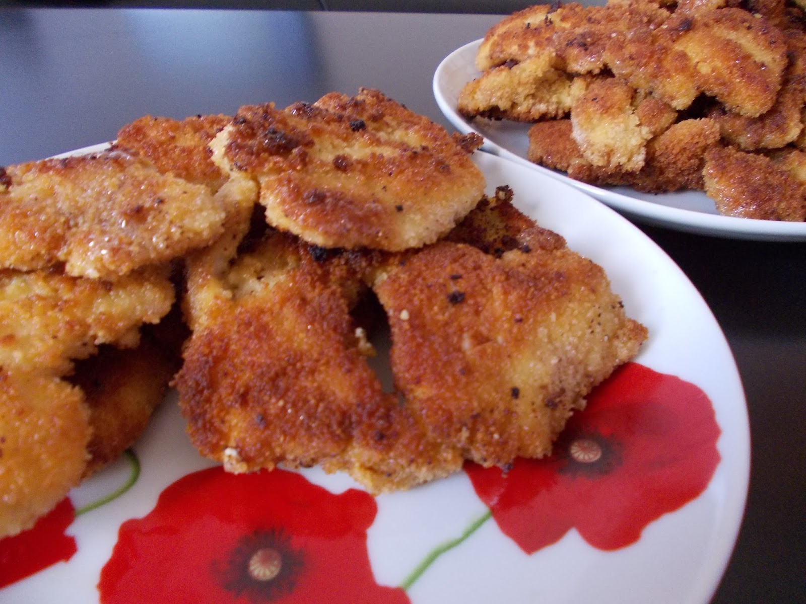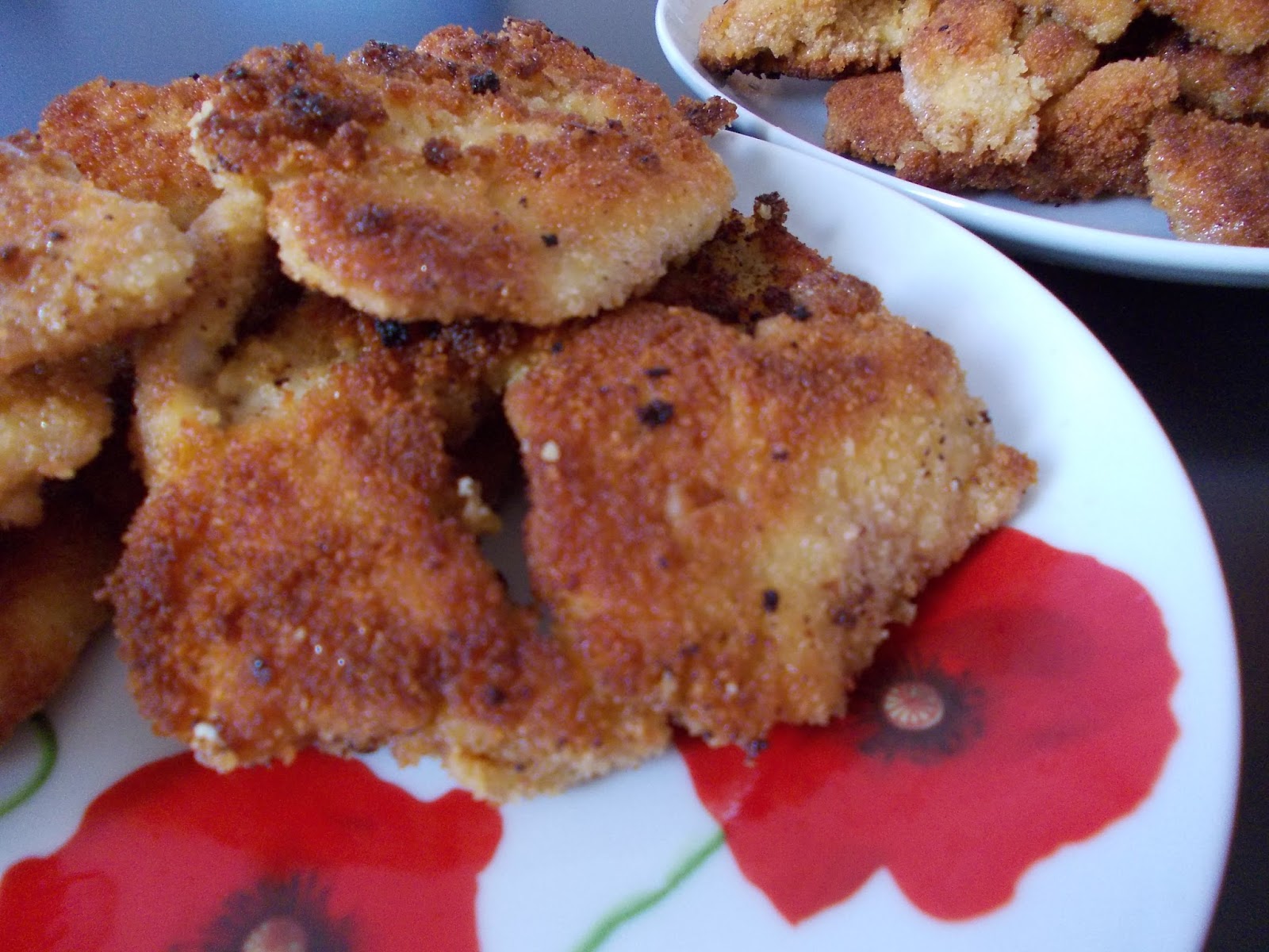 Każdy kawałek obtaczam najpierw w jajku, potem w bułce tartej. Na patelni rozgrzewam oleju i smażę kilka minut na jednej stronie, potem na drugiej.