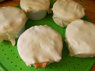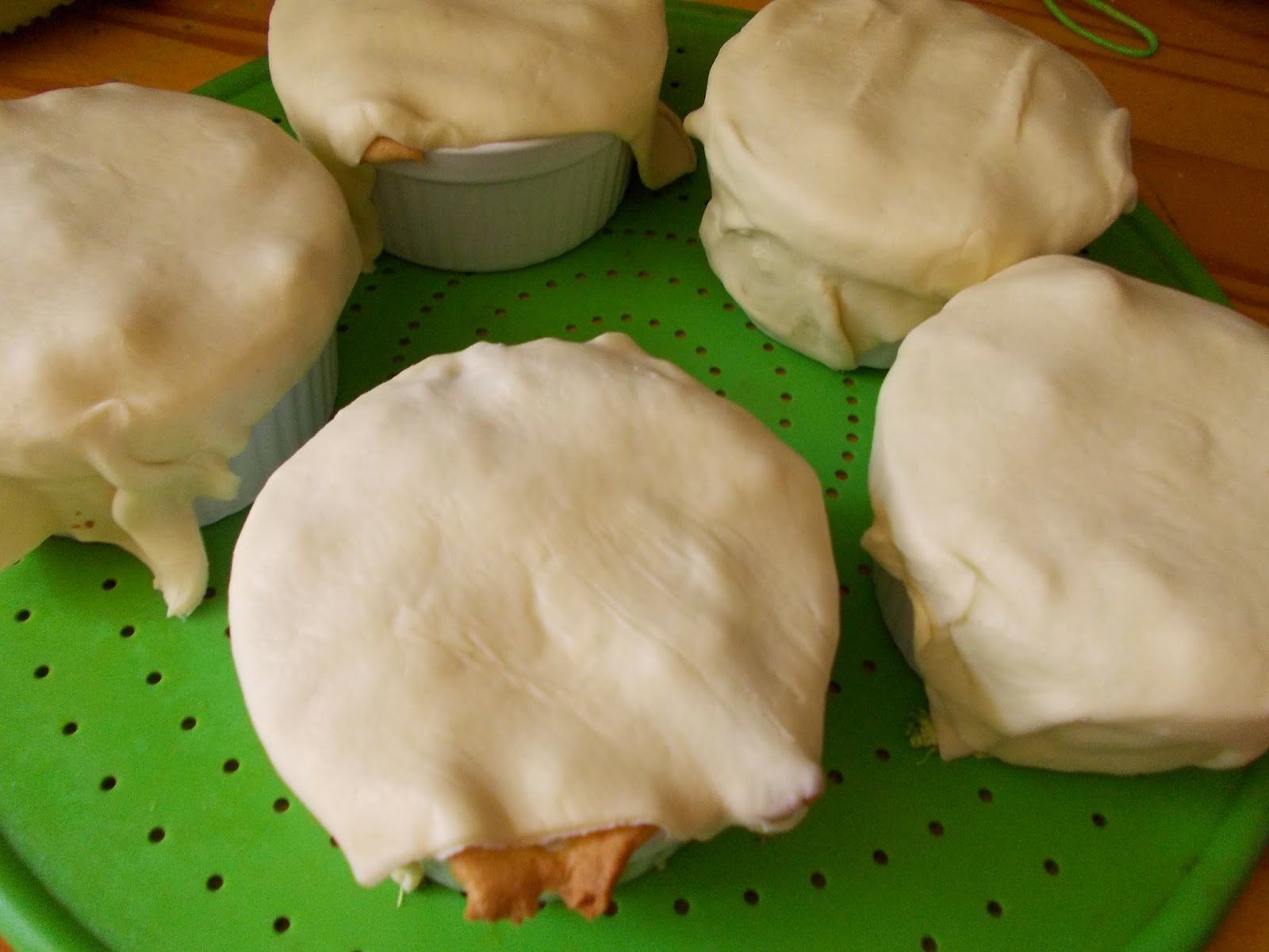 Polewam zawartość kokilek częścią sosu, przykrywam kwadratem ciasta dostosowanym do kokilki, lekko dociskam krawędzie. Wierzch nakłuwam widelcem.