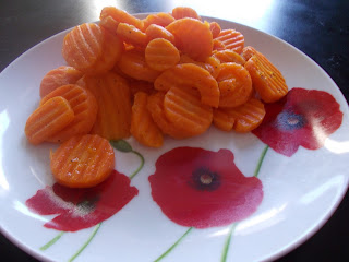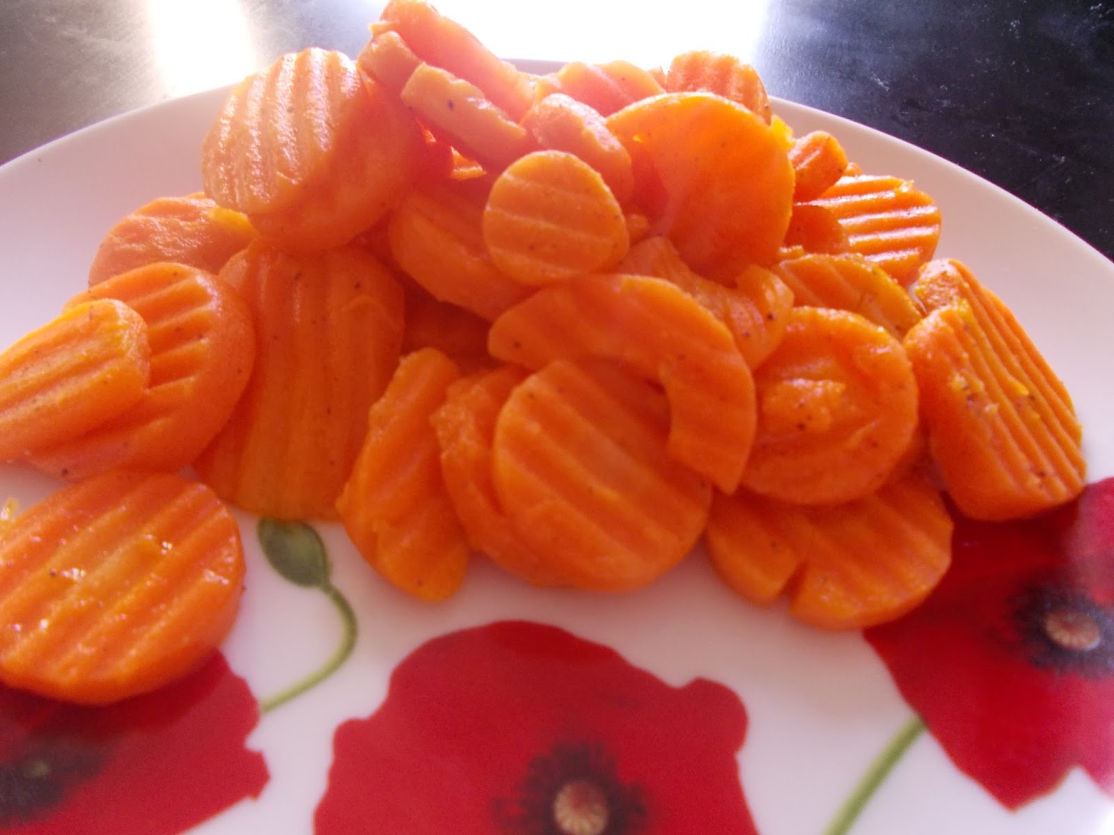 Marchewkę kroję w plasterki. Wkładam do małego garnuszka i zalewam wodą. Dodaję cukier, połowę masła, sól i pieprz. Przykrywam i gotuję na małym ogniu do miękkości marchewki. Nadmiar płynu wylewam. Ewentualnie doprawiam. Dodaję do marchewki masło i jeszcze raz podgrzewam.