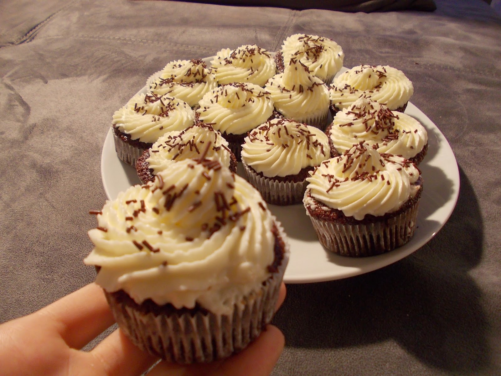 Przygotowuje krem: Śmietankę ubijam na sztywno z cukrem pudrem. Dodaje po łyżeczce serek mascarpone i aromat waniliowy i miksuje, aż uzyskam gładki krem. Przekładam do rękawa i tworzę piękny wzór. Na koniec tylko posypka... i niebo w gębie gotowe:)