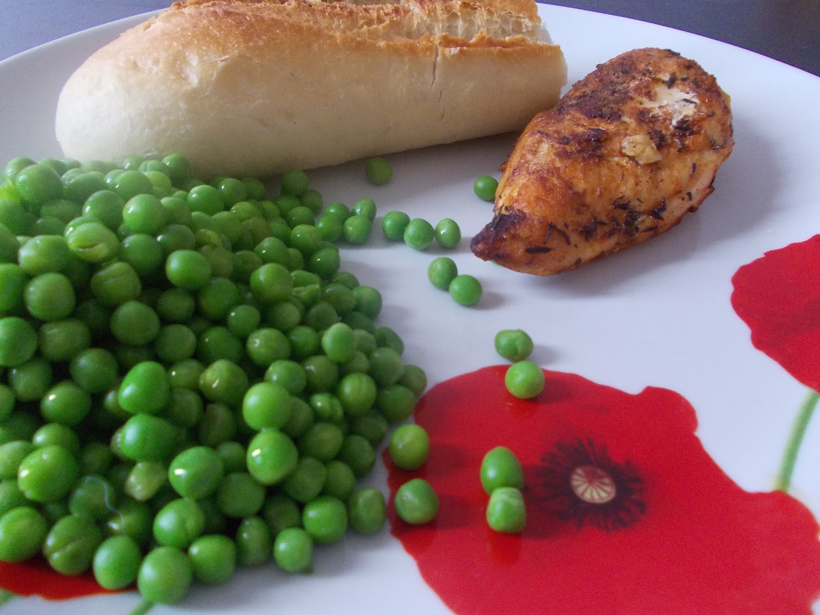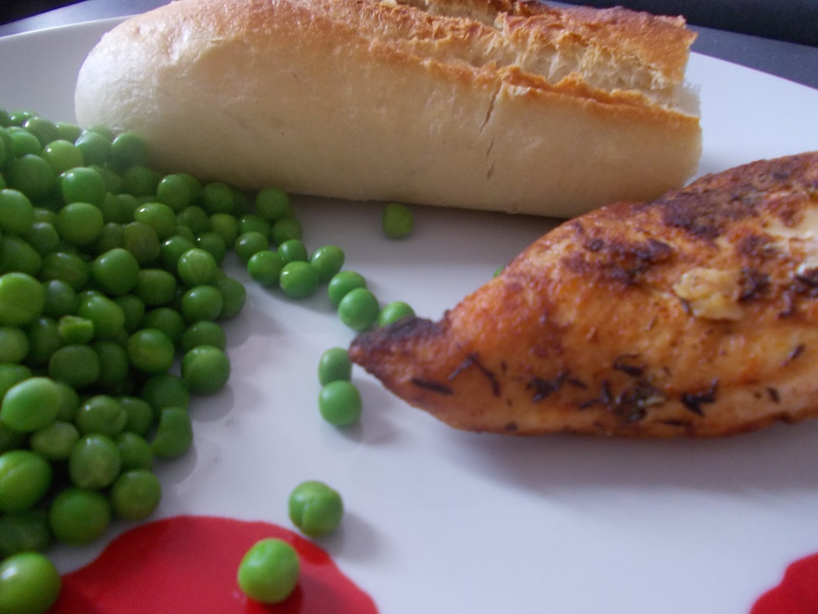 Przygotowuje marynatę: do miseczki wlewam kilka łyżek oliwy, 1 łyżkę każdego z ziół, papryki w proszku, przeciśnięty przez praskę czosnek, sól, ziele angielskie i liść laurowy. Mieszam. Piersi zanurzam w marynacie i wkładam do lodówki na co najmniej 2 godziny. Po tym czasie piekarnik rozgrzewam do około 180 stopni. Rozwijam folię aluminiową (błyszczącą stroną do góry), układam miąsko i przykrywam drugą częścią folii (błyszczącą stroną do piersi). Formuje kopertę, zwijam szczelnie brzegi. Na kopercie zacinam dziurki. Wkładam do piekarnika na około 1 godzinę. Pychota! Ja podałam z bagietką i groszkiem.