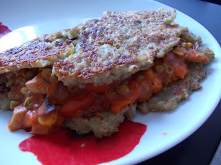 Mocno rozgrzewam dużą patelnię. Placki powinny być grube na około pół cm. Odpowiednią ilość ciasta rozsmarowuje na całej powierzchni patelni. Smażę do zrumienienia. Przewracam placek na drugą stronę. Na połowę usmażonego placka nakładam gulasz. Przykrywam drugą połową placka.